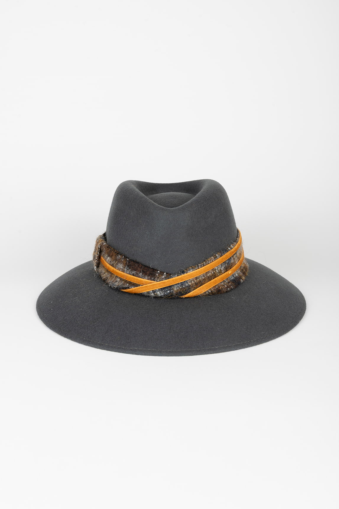 - Sombrero de fieltro con copa tipo fedora y ala amplia.