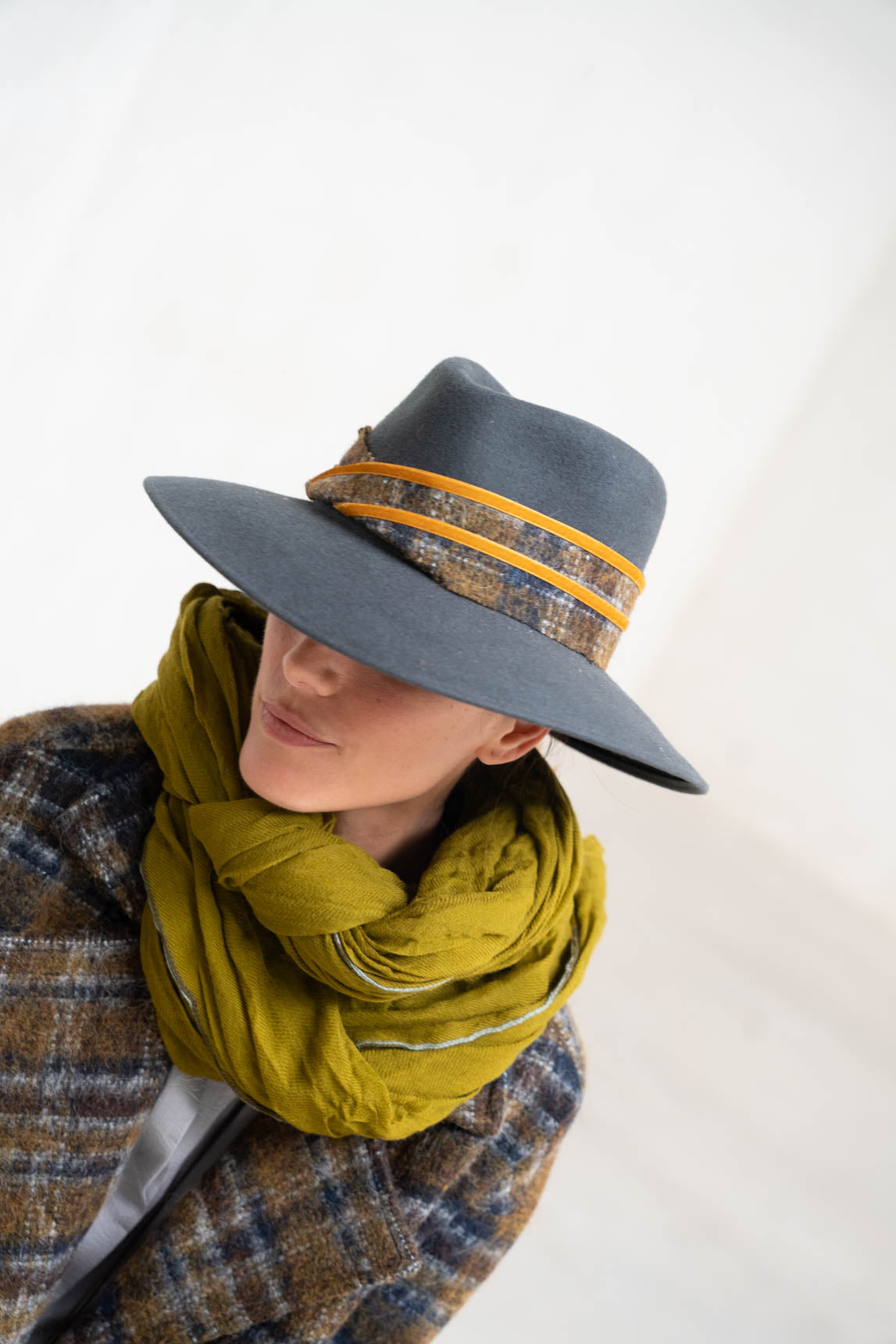 - Banda de tweed en cuadros gris/antracita con toques mostaza y cordón fino en color cuero–mostaza, a juego con el abrigo Gelgo cuadros mostaza de la colección Rivera.