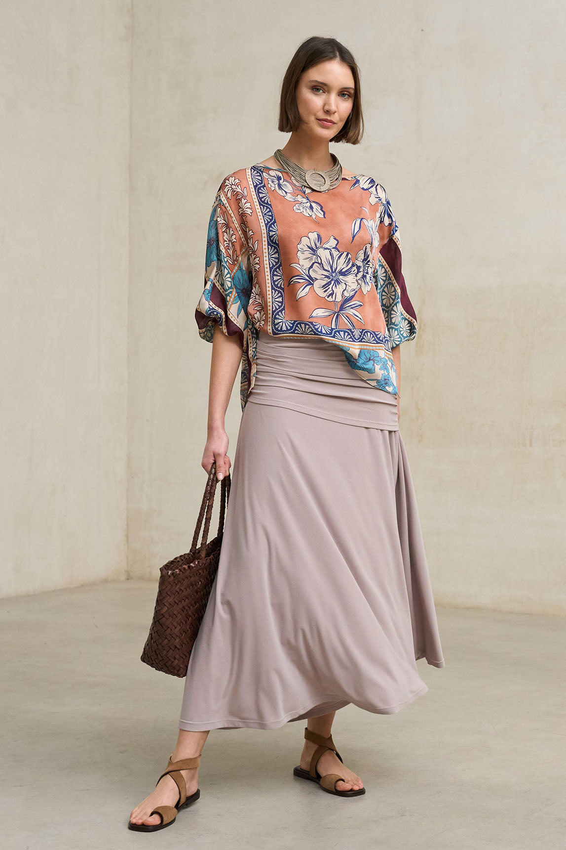 The Avenia printed blouse combines a flowing design with an artistic pattern in terracotta, teal, and neutral shades, creating a piece with character yet easy to integrate into your wardrobe. Its print complements the matching skirt, allowing you to create a coordinated outfit with a dress-like effect.