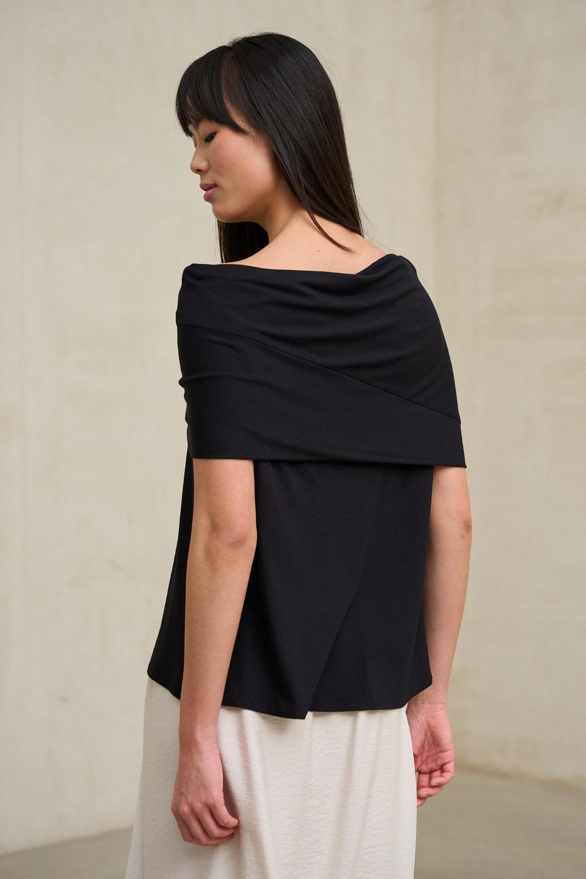 The black Oryen T-shirt reinterprets the wrap-around design in a more sophisticated and assertive version. Its wide boat neckline and overlapping band on the upper part create an architectural silhouette that provides presence without losing fluidity.