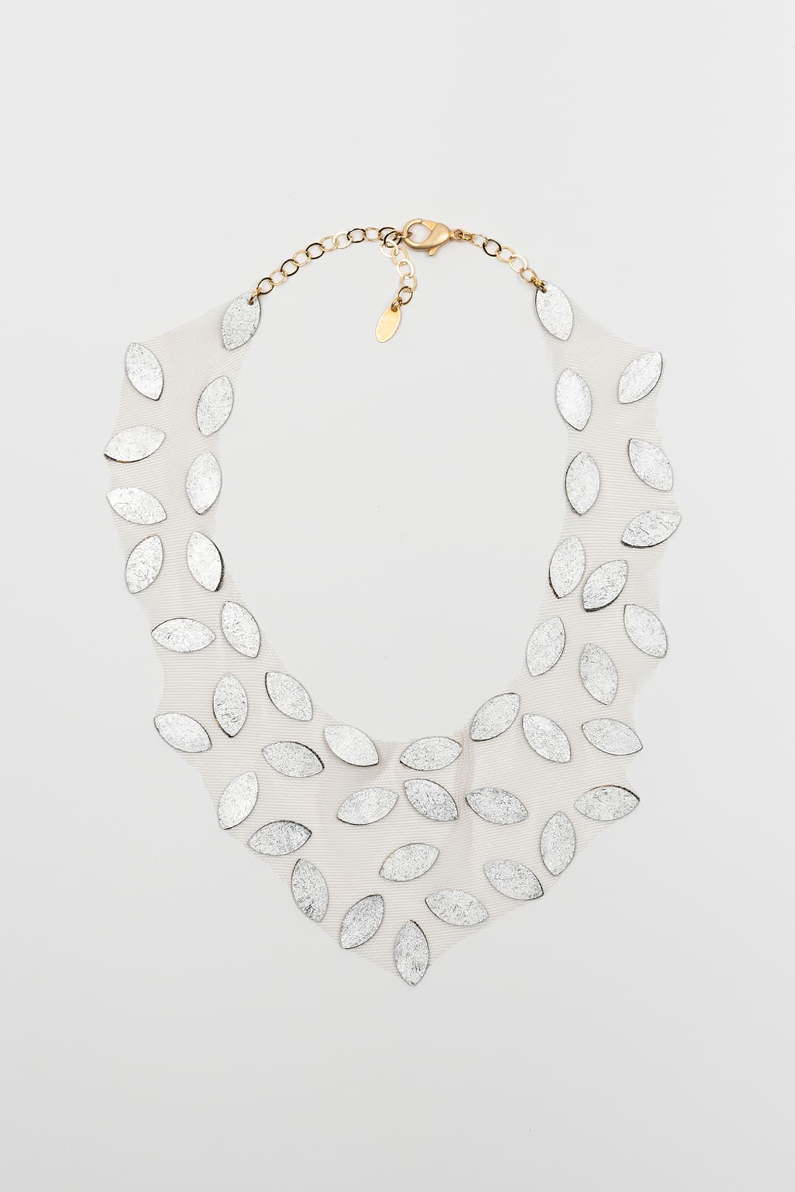 Bib-style necklace made from lightweight, flexible, semi-sheer ivory tulle. It is decorated with multiple textured gold-tone, almond-shaped metal appliqués, distributed throughout to create a mosaic effect. It fastens at the top with an adjustable chain and lobster clasp for a secure fit.