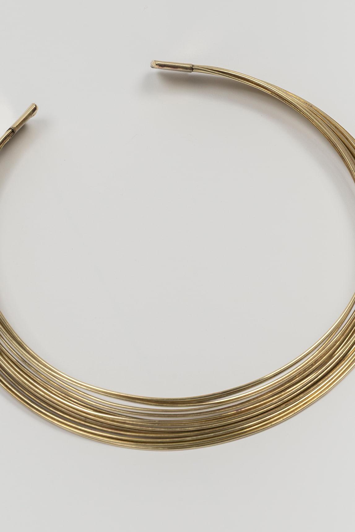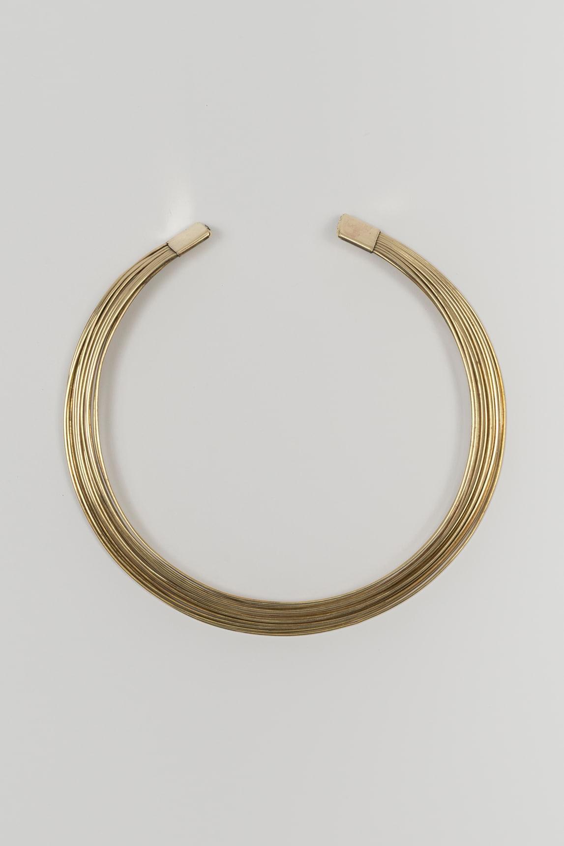 Collar de mujer en latón con diseño multicadena y estructura rígida de tipo gargantilla abierta. La pieza se compone de varias líneas finas superpuestas que crean un efecto envolvente, ligero y muy visual alrededor del cuello, aportando brillo y una presencia sofisticada sin resultar excesiva. Su forma limpia y abierta refuerza una estética contemporánea, elegante y muy fácil de integrar.