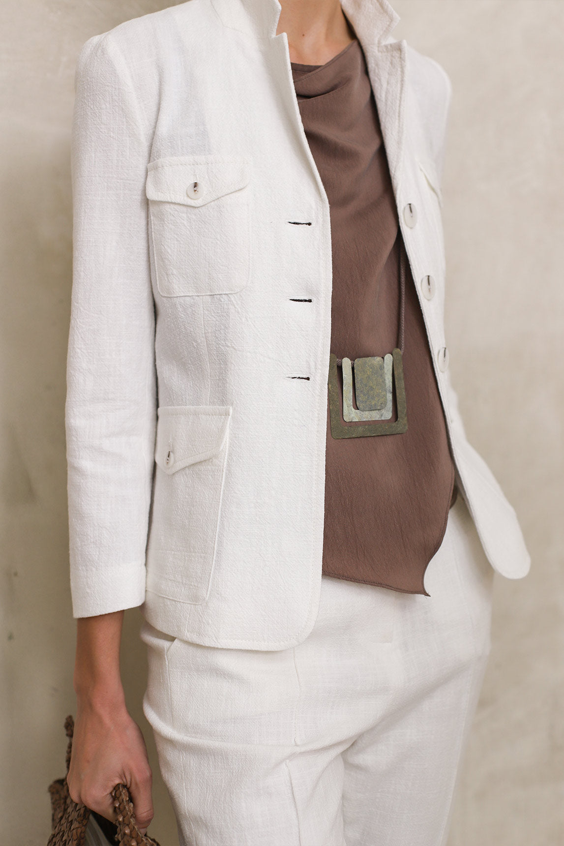 The aged metallic finish lends a sophisticated, slightly matte touch that complements the design's defined structure. Wear it over turtlenecks for a minimalist contrast, or over a plain tee to effortlessly elevate an everyday look; it also works well over simple dresses when you're looking for a touch of character without overwhelming the wearer. Its clean aesthetic suits polished, urban styles and blends easily with other fine jewelry if you prefer subtle layering, keeping the pendant as the focal point.