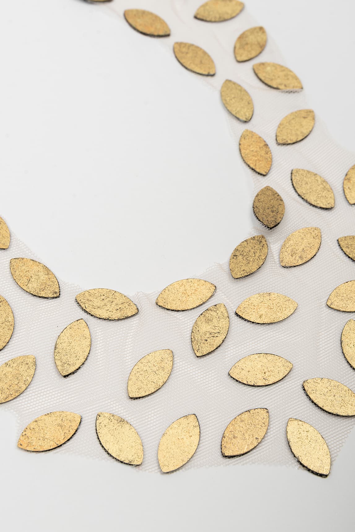 Bib-style necklace made from lightweight, flexible, semi-sheer ivory tulle. It is decorated with multiple textured gold-tone, almond-shaped metal appliqués, distributed throughout to create a mosaic effect. It fastens at the top with an adjustable chain and lobster clasp for a secure fit.