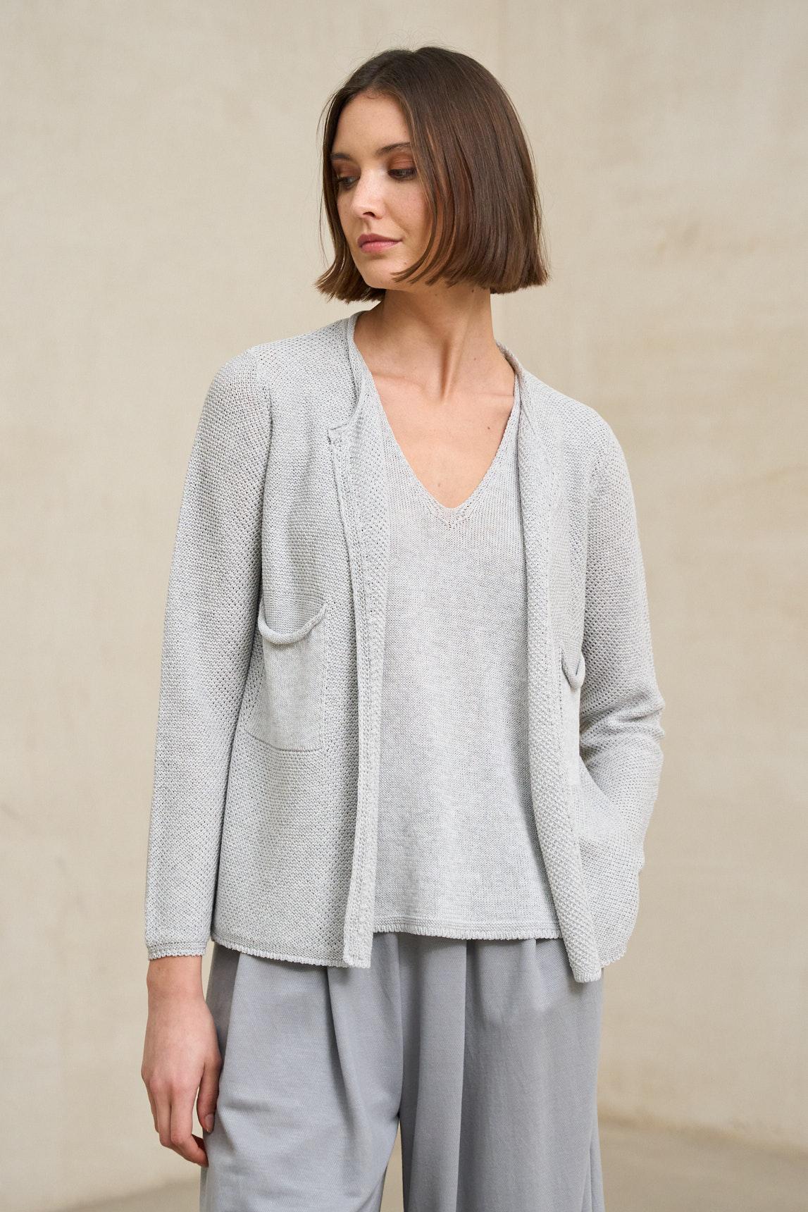 La chaqueta de punto Lierne gris claro es una prenda de mujer confeccionada en tejido de punto ligero de tacto natural y estructura flexible. Su diseño sin solapa, con escote redondeado y cierre frontal con botones al tono, mantiene una línea limpia y actual. La caída suave y el ligero volumen en el bajo aportan dinamismo y una silueta favorecedora sin marcar la figura.