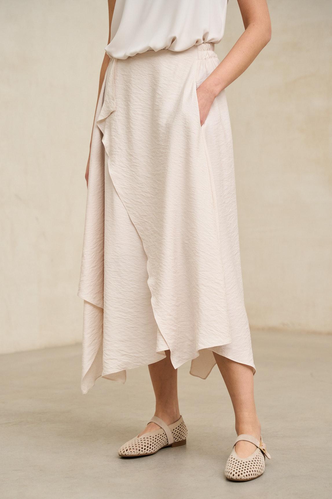 Falda midi confeccionada en tejido ligero con caída fluida y movimiento natural. Presenta diseño envolvente con superposición frontal y bajo asimétrico en diagonal que aporta dinamismo y estiliza visualmente la silueta. La estructura es limpia en la cintura, permitiendo un ajuste cómodo y favorecedor.