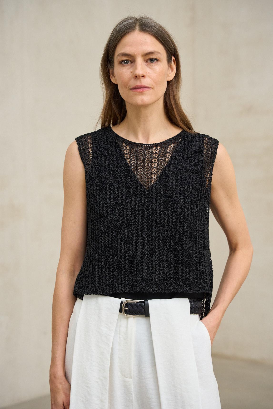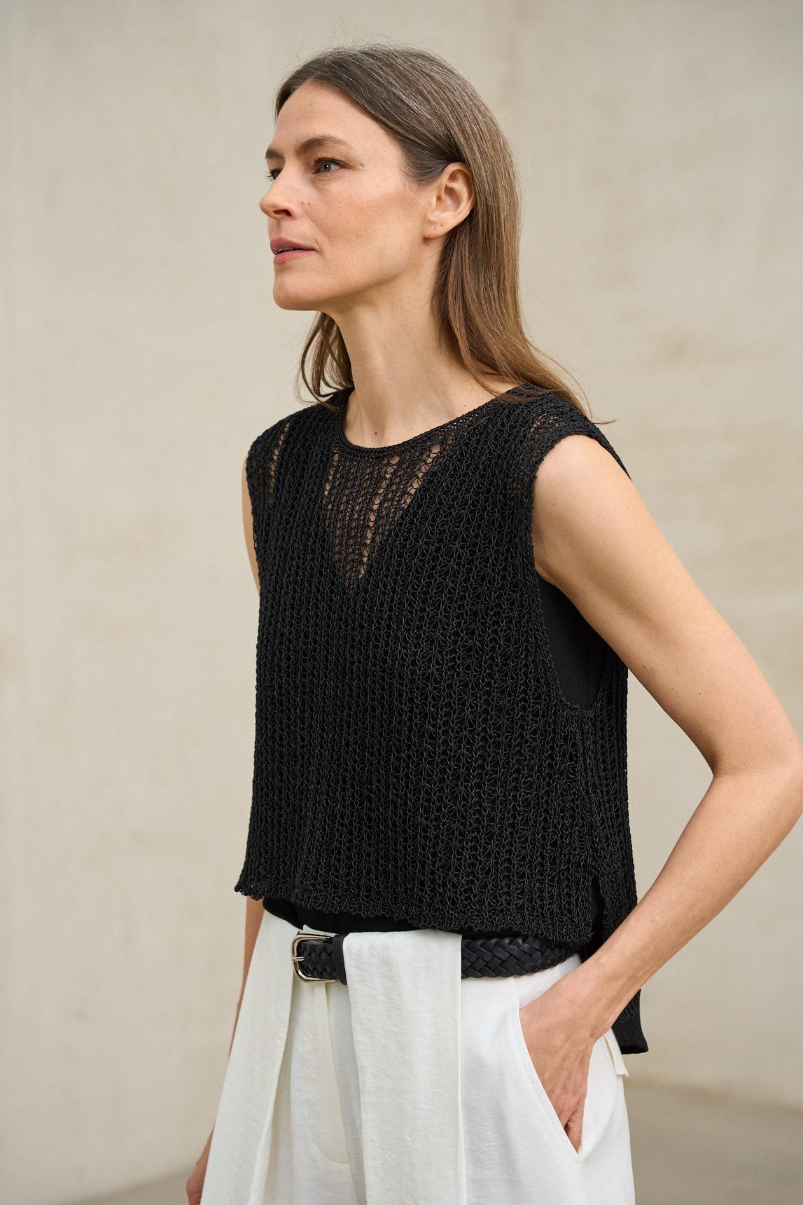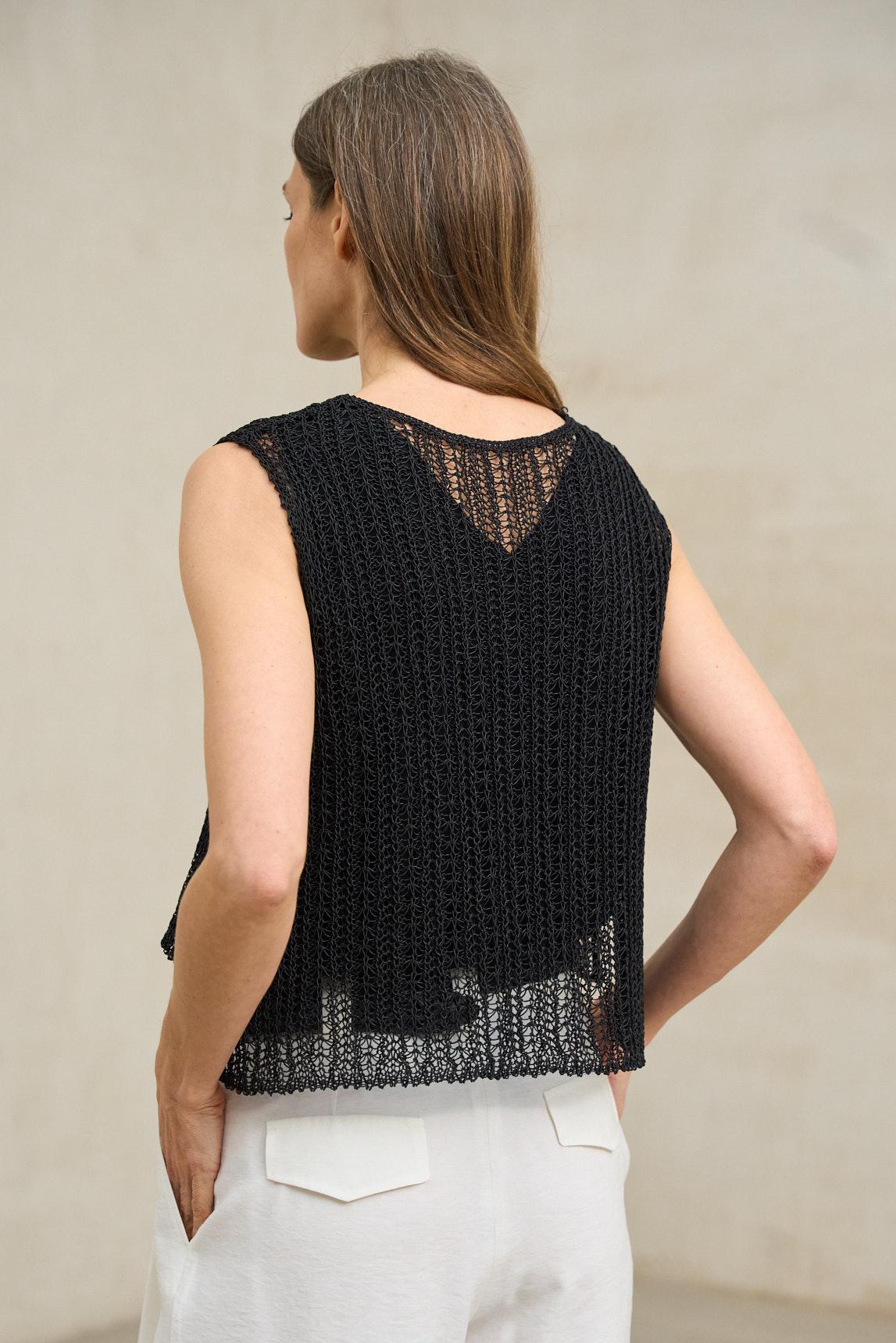 El chaleco Erya negro es una prenda de punto ligero con textura calada que aporta profundidad y carácter al diseño. Su trama abierta genera un efecto visual dinámico y ligeramente etéreo, por lo que se recomienda combinarlo con un top base o camiseta interior (no incluido) para un acabado equilibrado.
