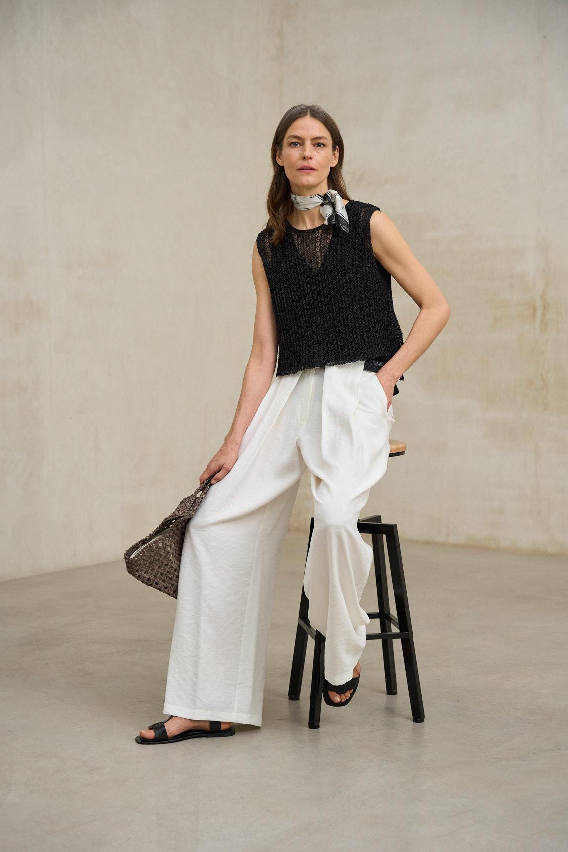 El tono negro refuerza su elegancia atemporal, facilitando combinaciones con pantalones blancos, tonos neutros o propuestas más sofisticadas en clave monocromática. Una prenda que equilibra sencillez y textura con un aire contemporáneo.