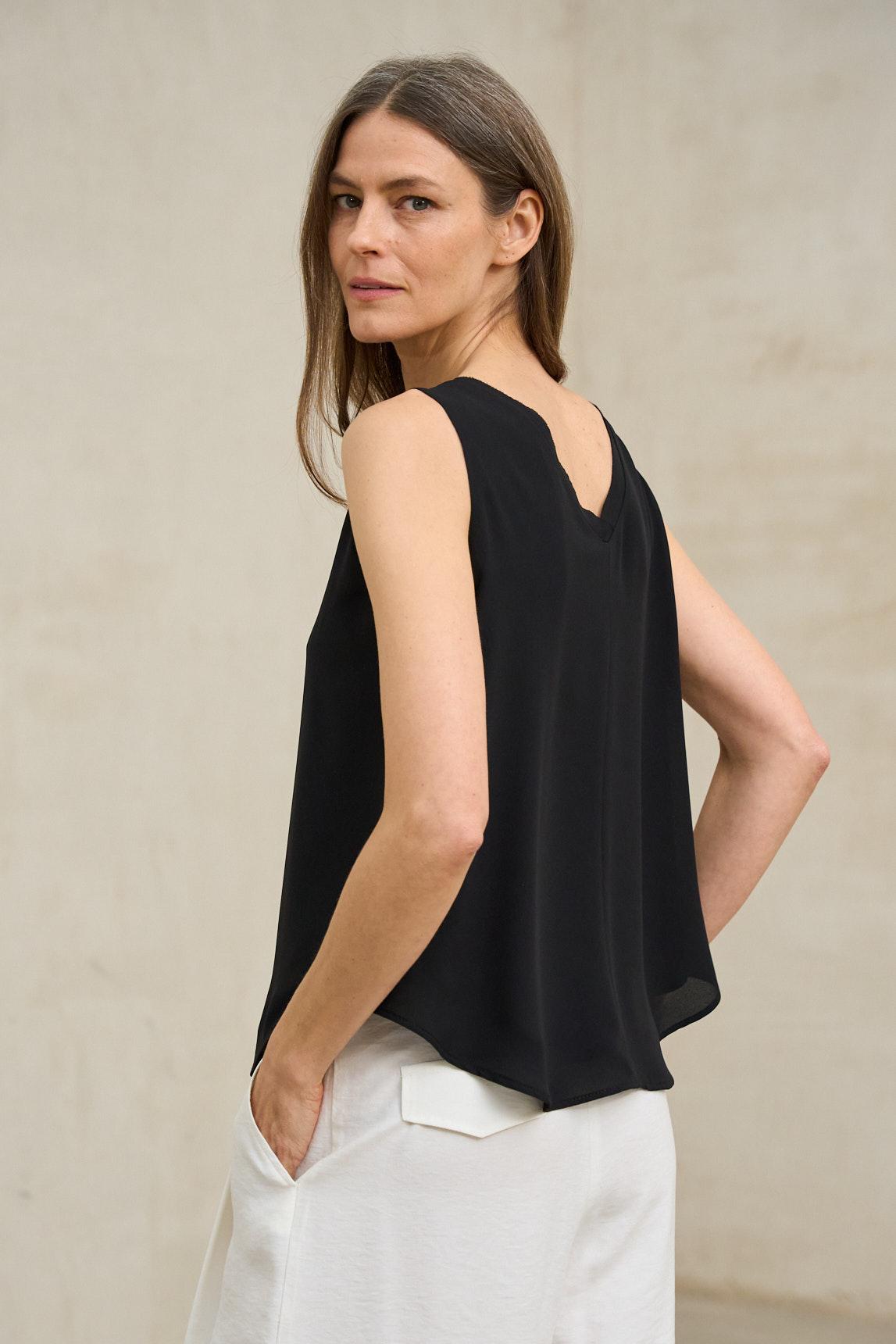 Este top sin mangas se caracteriza por su silueta amplia y su escote en pico pronunciado tanto en el delantero como en la espalda, generando una línea limpia y favorecedora. El tejido presenta una superficie lisa con caída fluida que aporta movimiento y ligereza visual. El bajo ligeramente redondeado suaviza la estructura general, mientras que el corte suelto permite un ajuste cómodo y natural. Desde el punto de vista estilístico, es una prenda esencial con un aire sofisticado.
