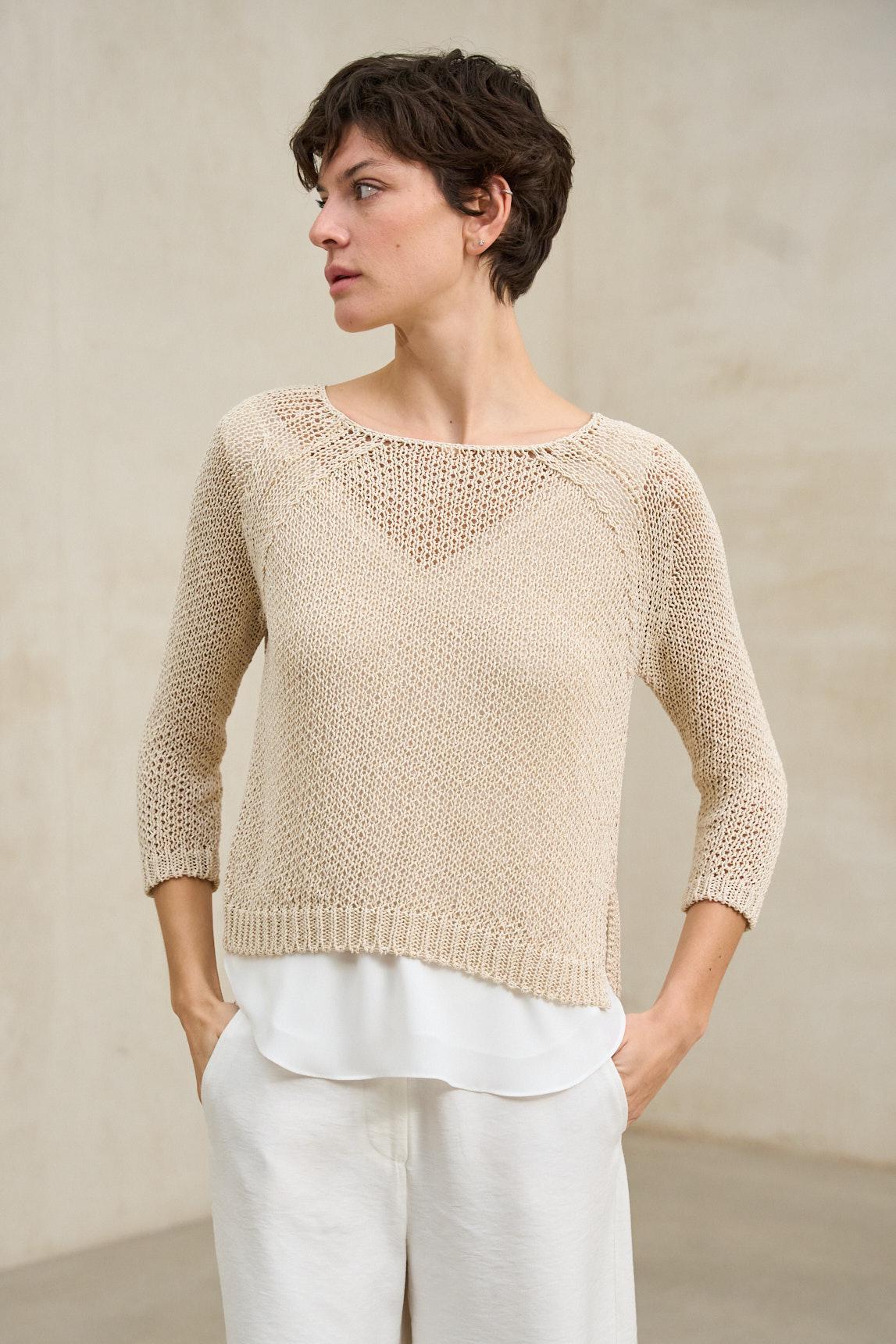 El jersey Évela beige arena combina la ligereza del punto fino con un delicado trabajo calado en la parte superior que aporta textura y profundidad visual. Su tejido es sutilmente translúcido, generando un efecto ligero y etéreo; se recomienda llevarlo con top interior (no incluido), como el top Alenia blanco roto para un acabado natural y equilibrado. Presenta escote amplio y manga tres cuartos, con una estructura suave que acompaña el movimiento sin ceñir. Su silueta relajada lo convierte en una pieza ideal para estilismos en capas y conjuntos de inspiración neutra. El tono beige arena transmite calidez y armonía, combinando especialmente bien con pantalones fluidos en crudo, verde oliva o tonos tierra. Una prenda versátil pensada para un armario sereno y sofisticado. Nos esforzamos por mostrar los colores de la forma más fiel posible, pero pueden variar ligeramente respecto a la realidad.