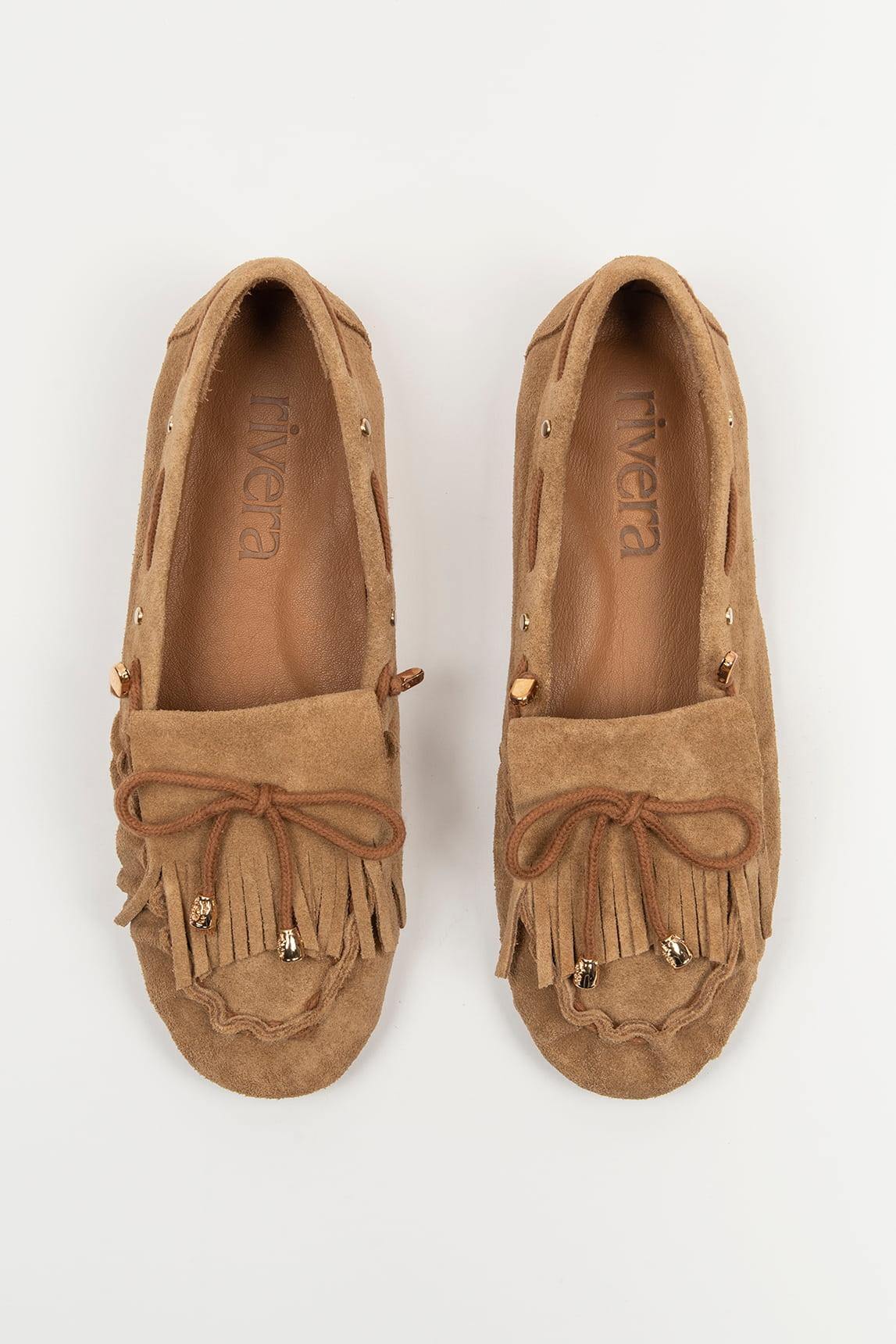 El mocasín Flecco camel reinterpreta el clásico mocasín con un diseño relajado y lleno de carácter. Destaca por su detalle de flecos en el empeine y el lazo decorativo con terminaciones metálicas, elementos que aportan movimiento y un toque artesanal al conjunto.