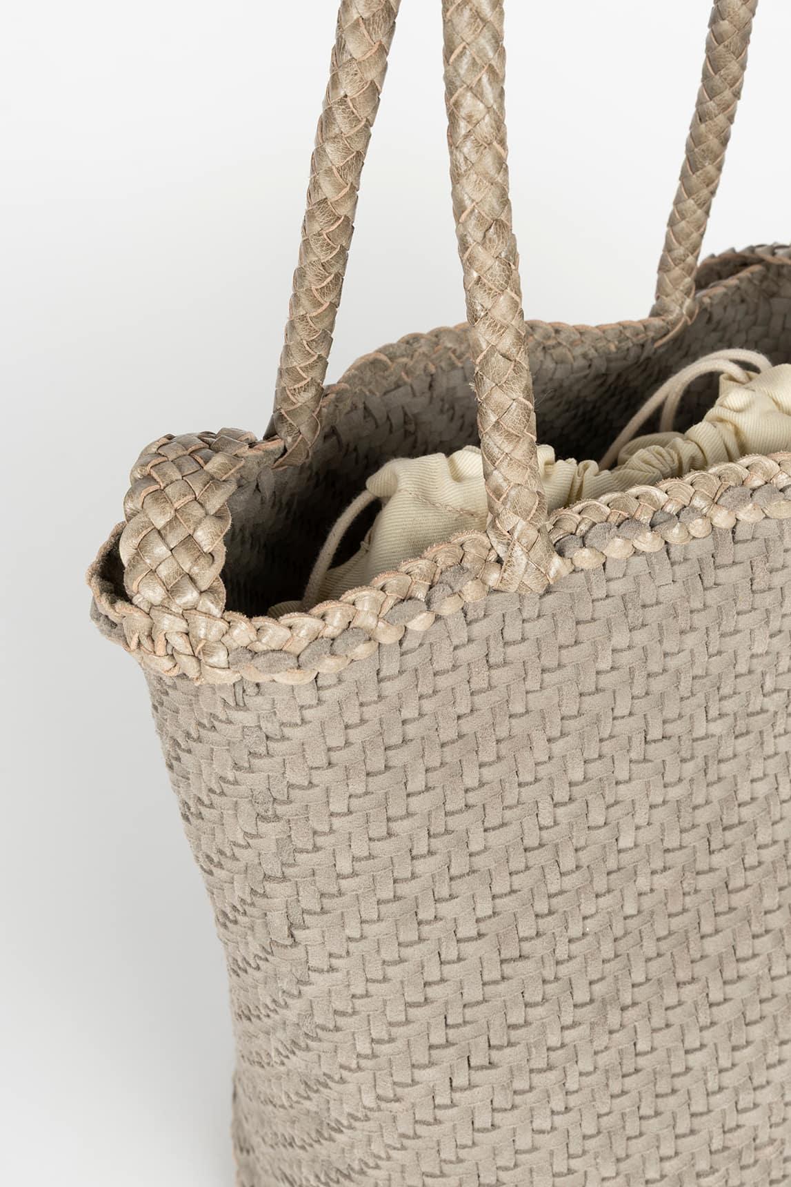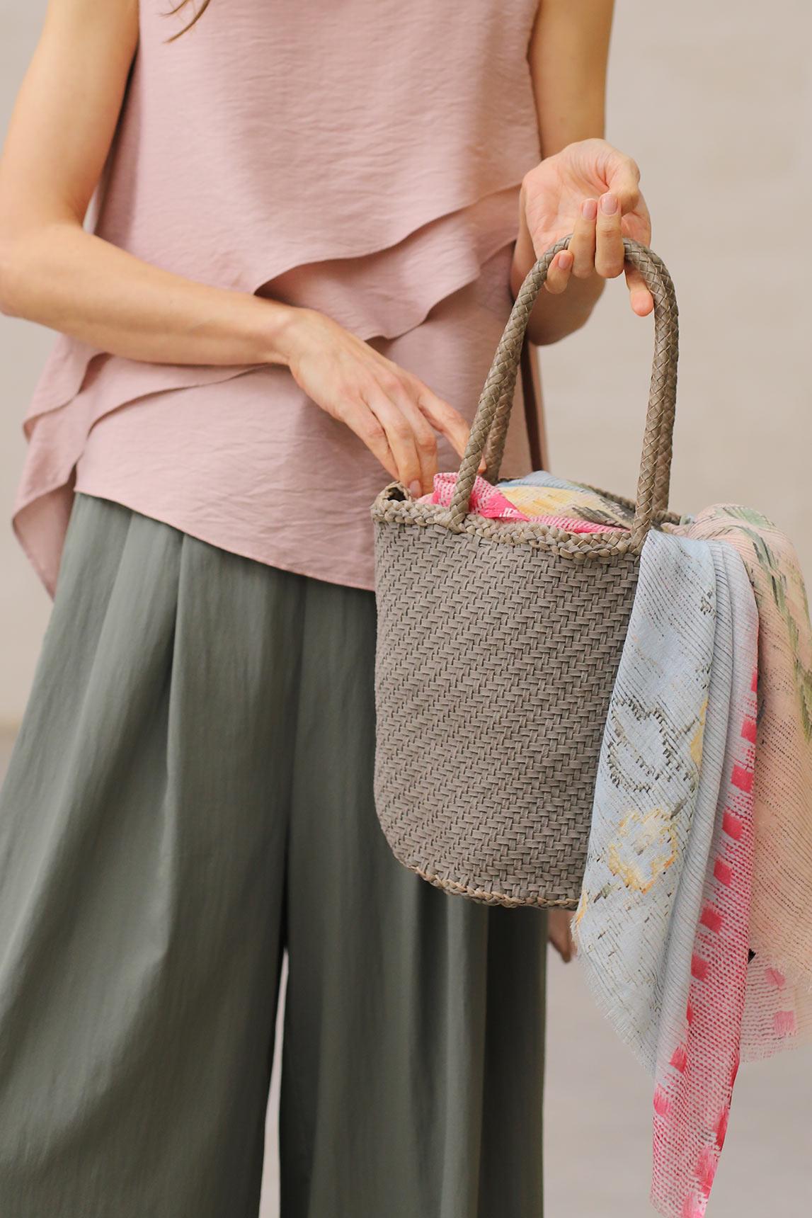 El bolso Serelis gris es una pieza de piel trenzada que destaca por su estructura tipo cubo y su diseño depurado de inspiración artesanal. El trenzado fino y uniforme aporta textura y profundidad, creando un efecto visual elegante y atemporal.