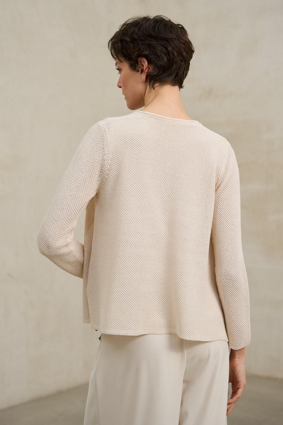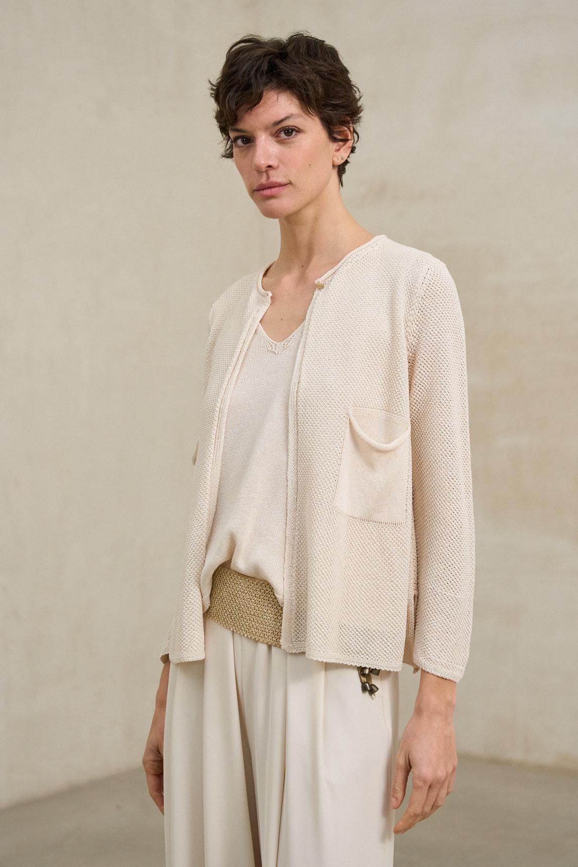La chaqueta de punto Lierne crudo es una prenda de mujer confeccionada en tejido de punto ligero de tacto suave y caída fluida. Presenta escote redondeado sin solapa, cierre frontal con botones al tono y manga larga. Su diseño incorpora un ligero juego de volúmenes en el bajo, creando una silueta relajada y contemporánea que aporta movimiento al conjunto.