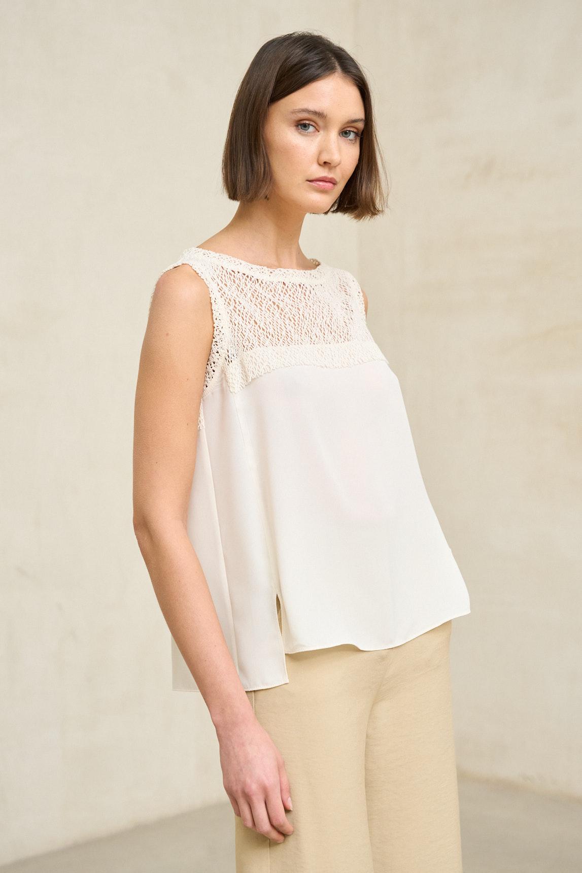 El Top Elenya crudo es una prenda ligera y femenina que combina sencillez con un sutil detalle artesanal. Confeccionado en tejido suave y de caída natural, presenta un diseño sin mangas con escote redondeado y acabado limpio. La parte superior incorpora un delicado panel calado que aporta textura y un juego visual elegante sin recargar el conjunto. Este detalle añade un matiz especial al diseño, manteniendo una estética depurada y atemporal.