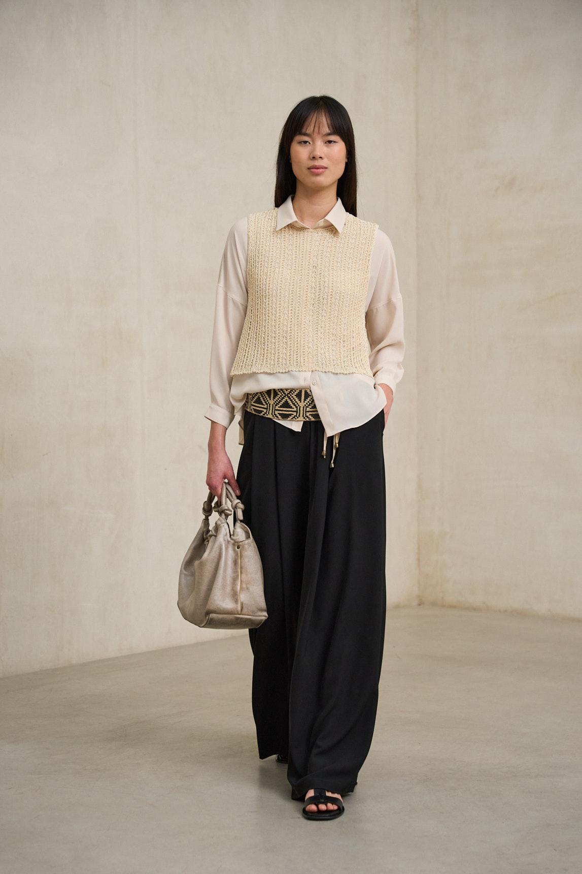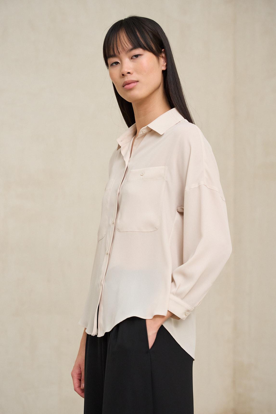 El tono crudo, cálido y versátil, la convierte en una base perfecta para estilismos neutros combinados con arena, camel, verde oliva o negro. Ideal para oficina relajada, viajes o looks minimalistas de primavera, es una pieza atemporal que aporta limpieza visual y sofisticación natural.