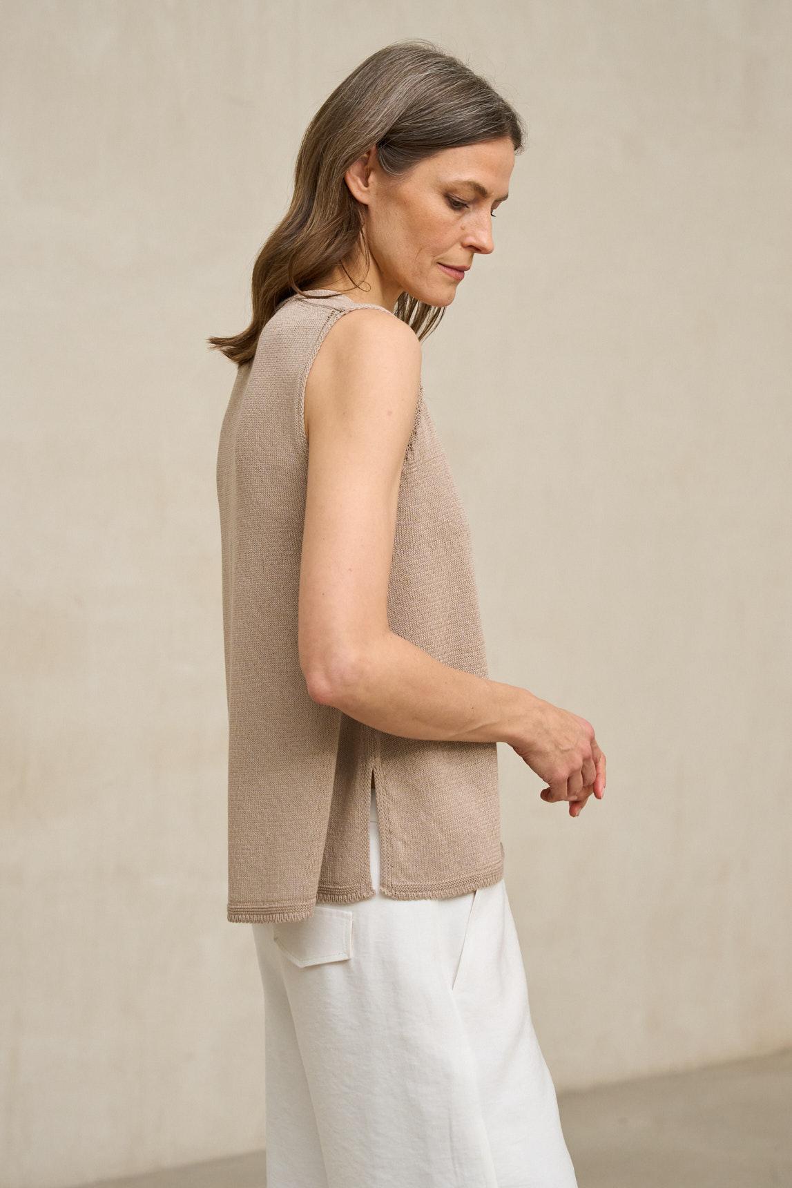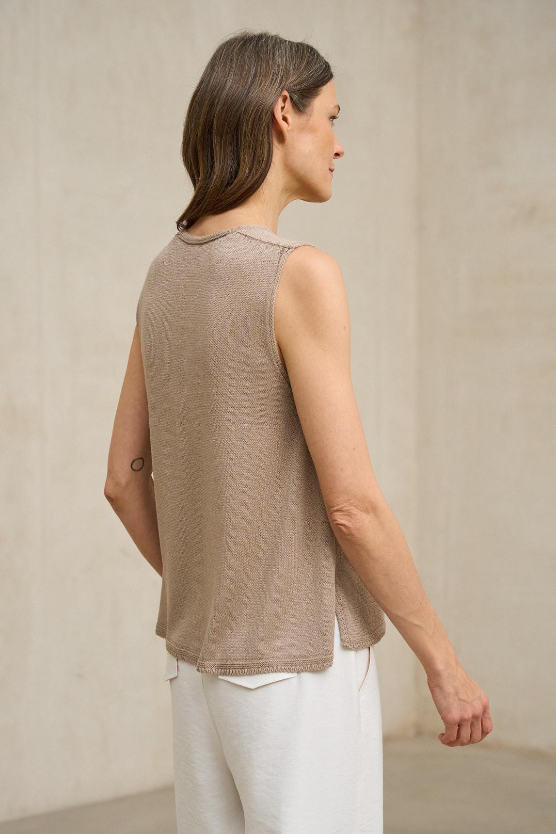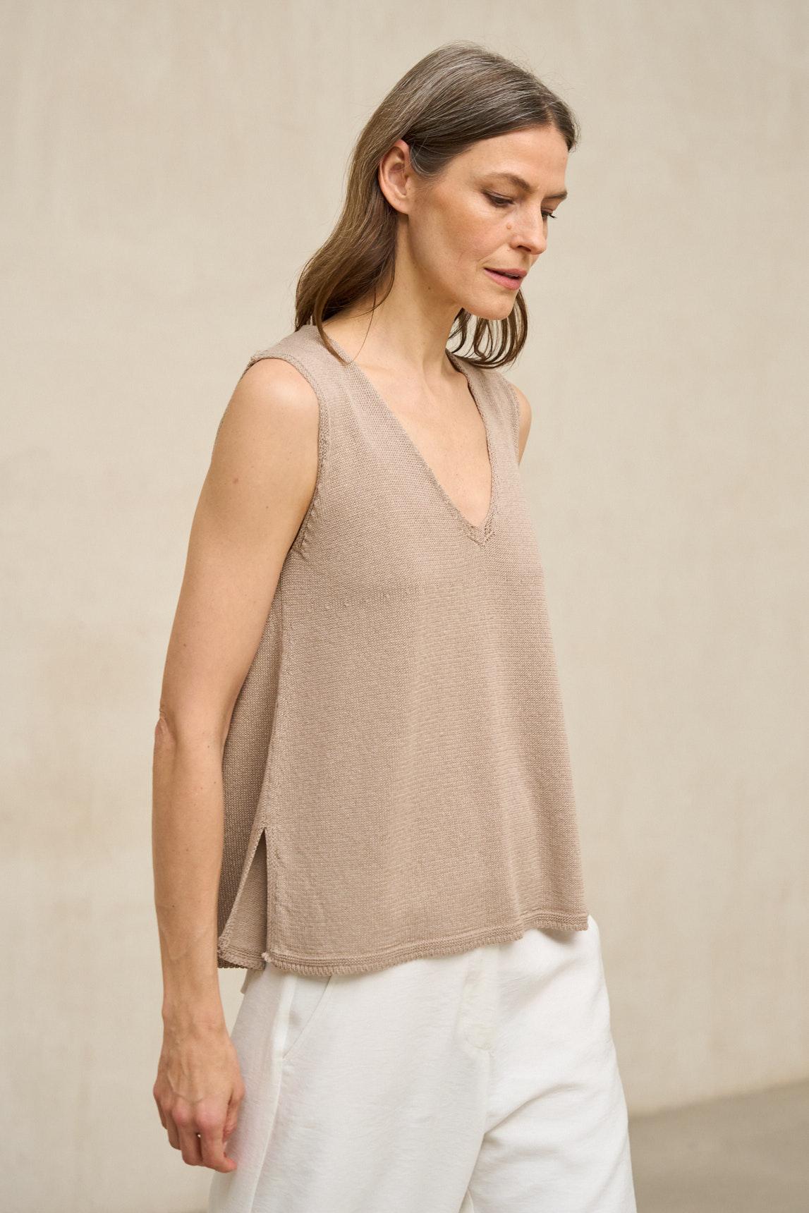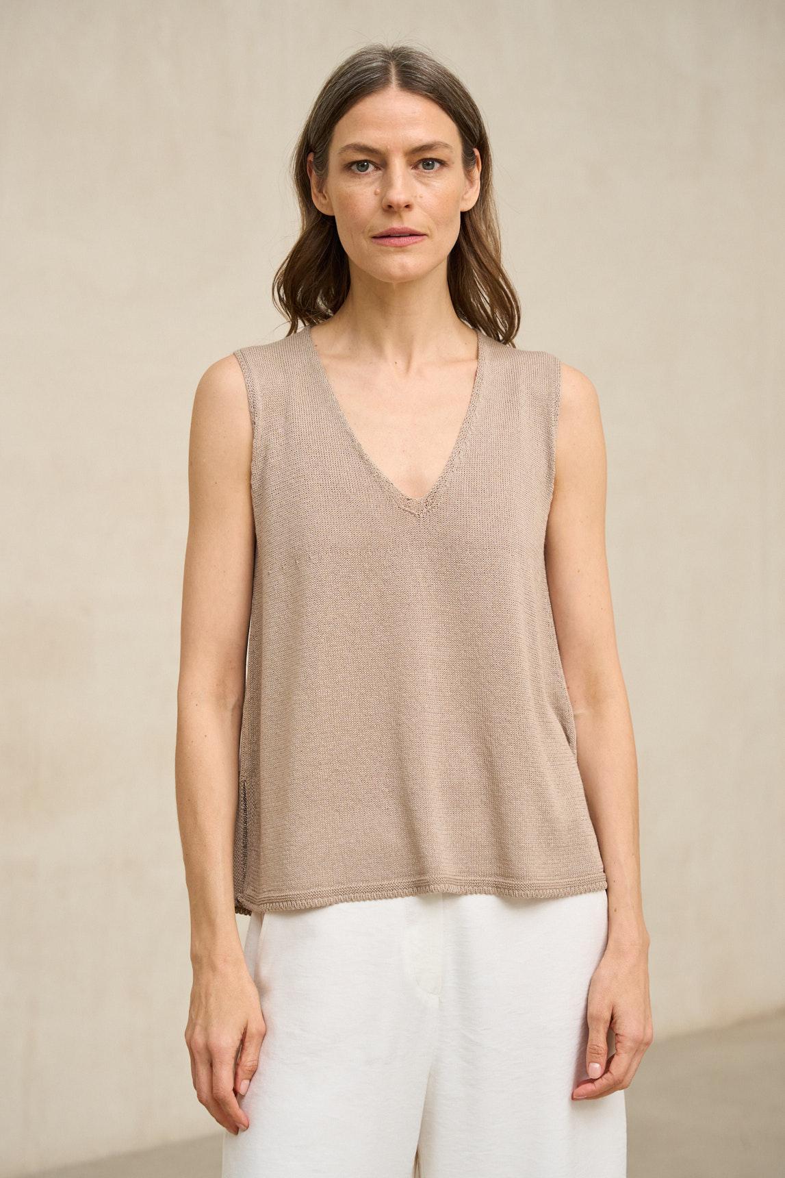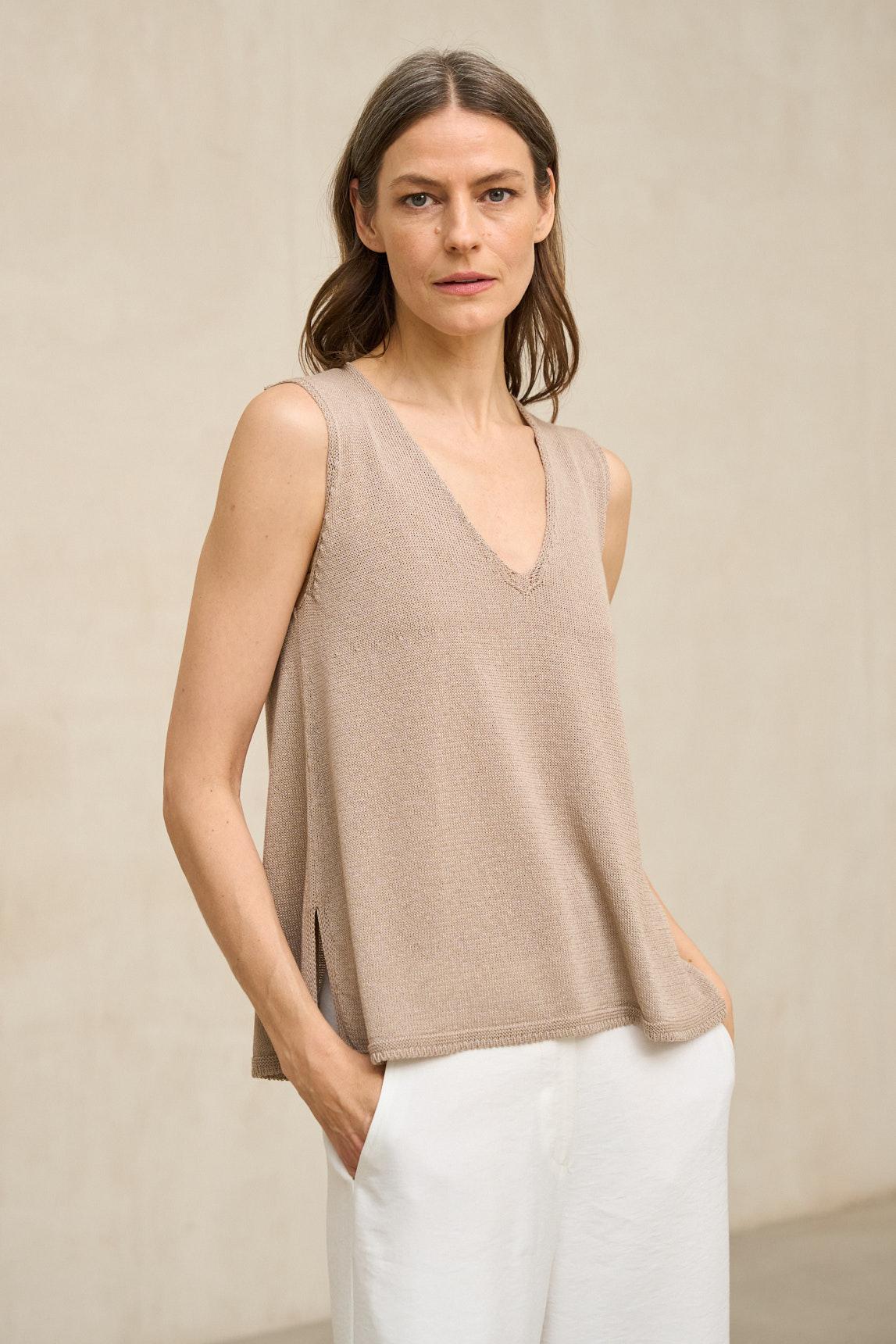El top de punto Virel arena es una prenda minimalista de líneas limpias que destaca por su silueta depurada y su caída natural. Confeccionado en tejido de punto ligero y suave, presenta escote en pico y diseño sin mangas que estiliza el torso con discreción. Su corte recto y fluido permite que la prenda se adapte al cuerpo sin ceñir, aportando comodidad y equilibrio visual.