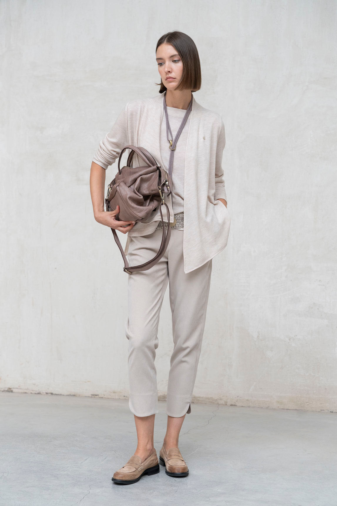 This bouclé-textured sash is a key piece for your fall and winter looks. Its mix of beige and taupe tones provides warmth, visual softness, and a natural feel that complements a wide variety of garments. The fluffy fabric adds volume without weighing you down, while the taupe grosgrain ribbons, with metal ends, allow for a comfortable and secure fit. Ideal for elevating outfits with sweaters, knit dresses, or pants with a cozy and sophisticated touch.