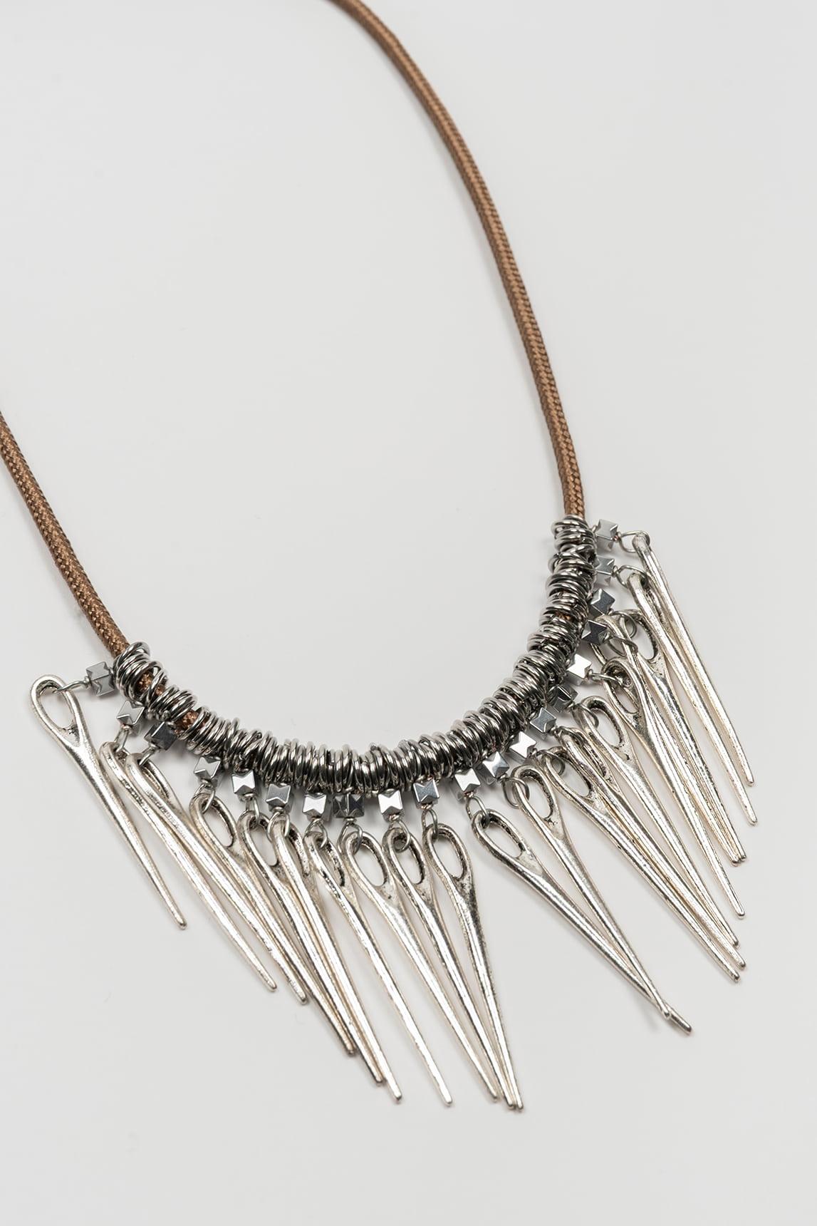 The Zerina necklace in silver features the same defined structure with a central base and multiple hanging rods that create a dynamic and luminous effect.