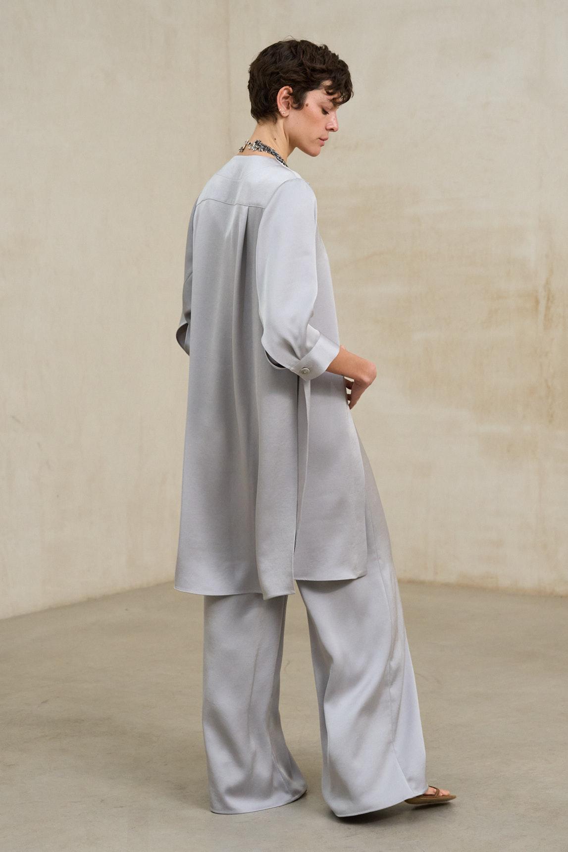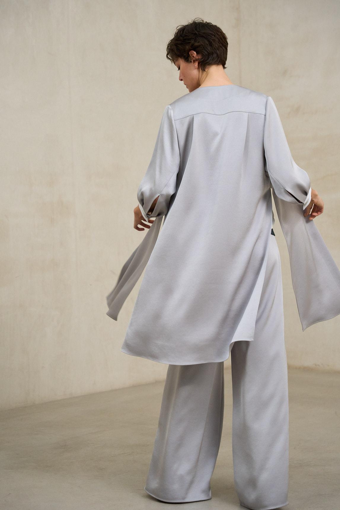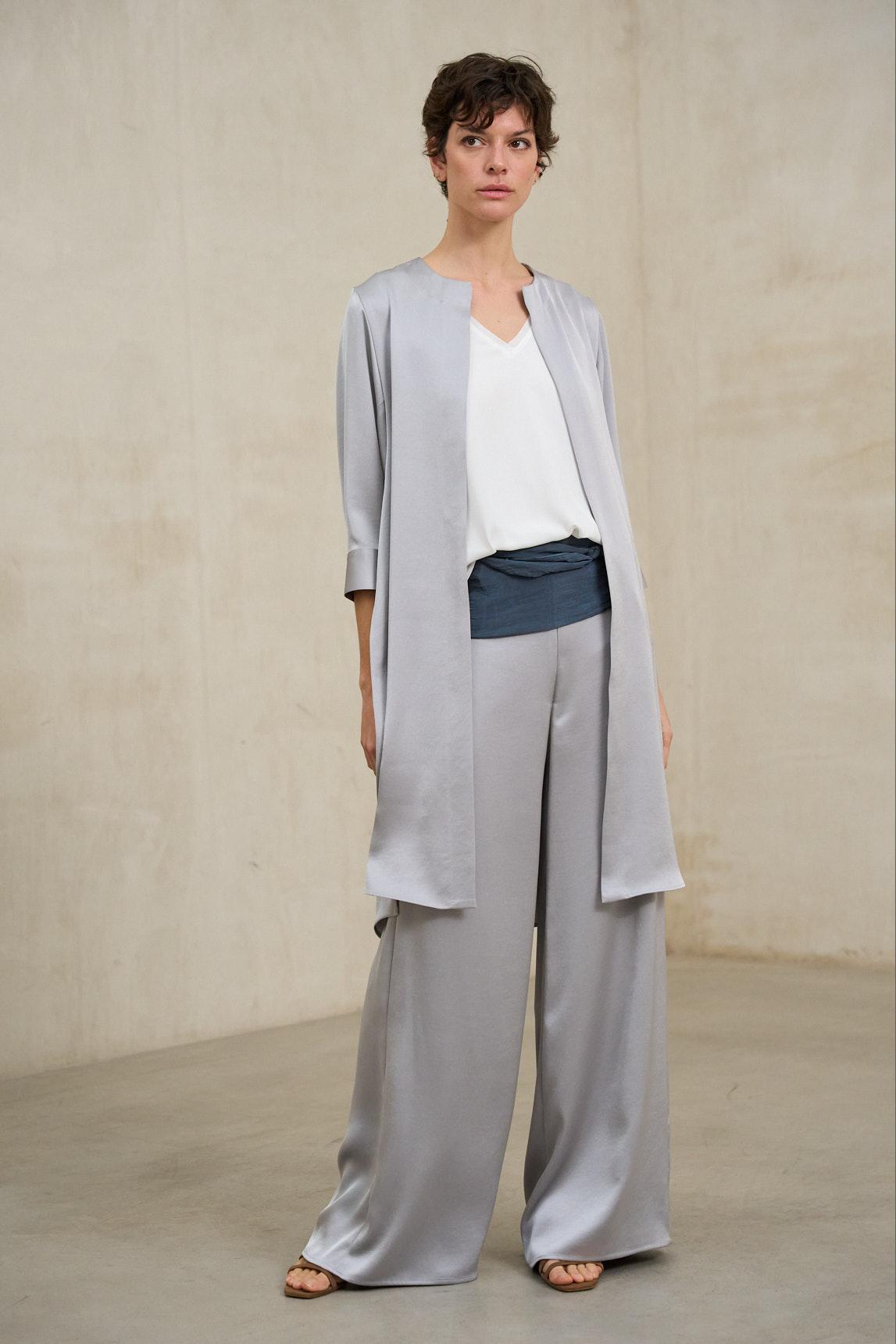 The Nayade blue-grey frock coat is a lightweight and sophisticated outerwear piece that flatters the figure thanks to its open design and vertical drape. Made from a fluid fabric, it falls below the hip, adding movement and elegance without any stiffness. Its clean structure, without visible buttons or closures, keeps the front uncluttered and creates a long, harmonious silhouette. The three-quarter sleeves balance the design and make it a versatile piece for transitional weather or for completing more formal outfits. The pearl blue hue brings serenity and sophistication, functioning as an elegant neutral within light and luminous combinations. Paired with the grayish-blue Sway trousers, it creates an ideal ensemble for events, celebrations, or special gatherings, achieving a refined, modern, and balanced look. Also perfect over white tops or minimalist blouses, the Nayade coat elevates any look with discretion and aesthetic coherence. We strive to display colors as accurately as possible, but they may vary slightly from reality.