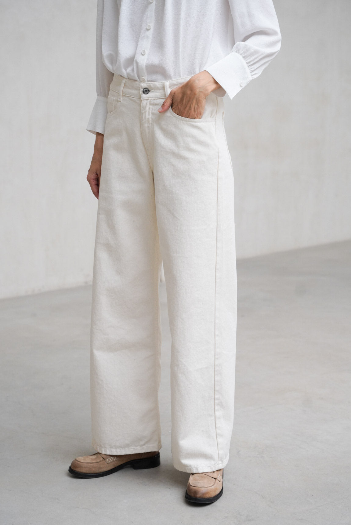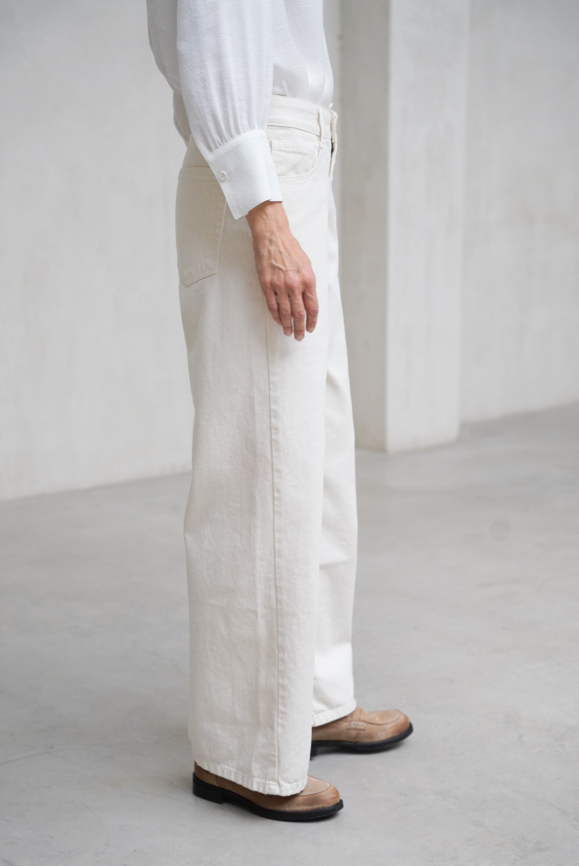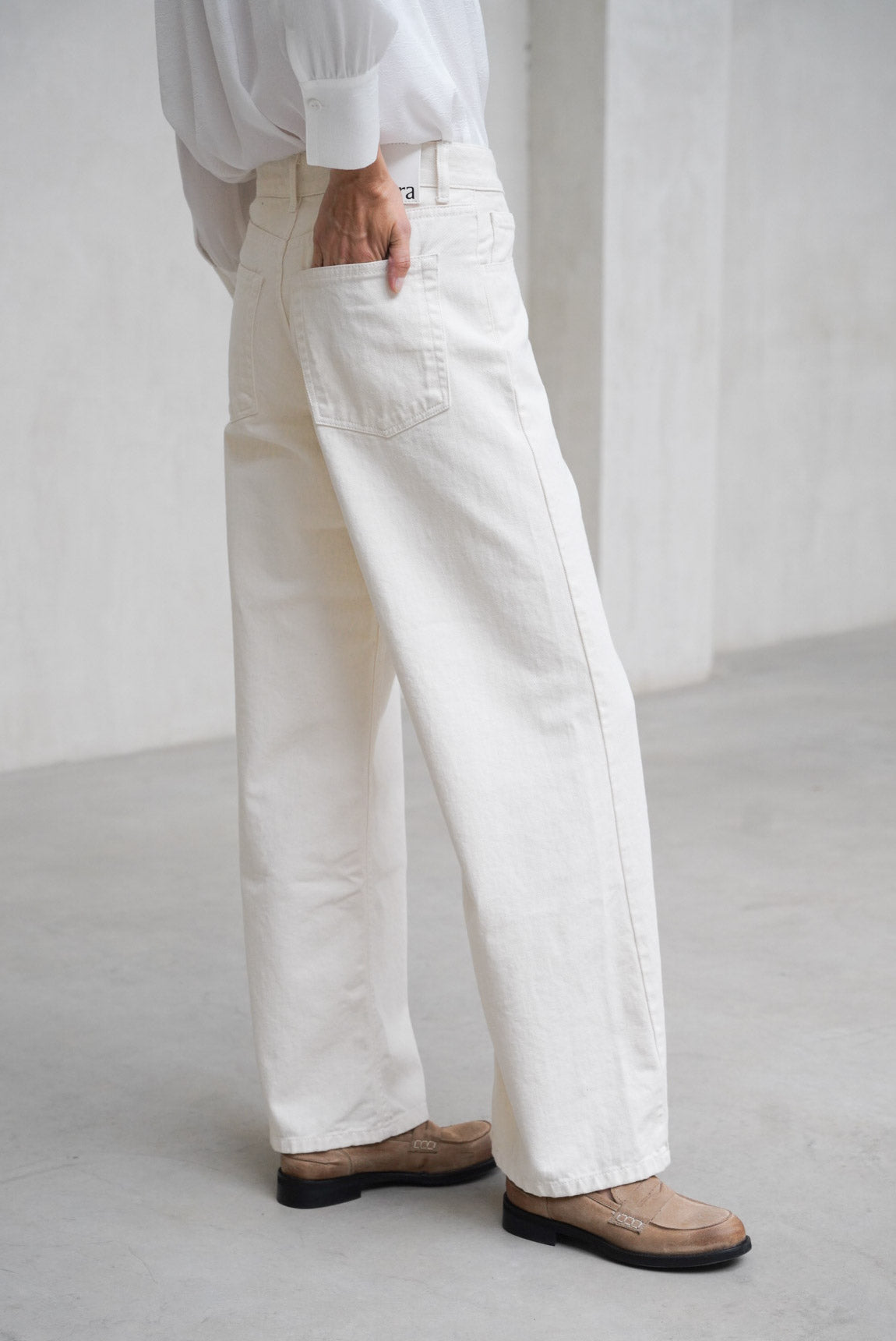 The raw Evoque pant is a luminous reinterpretation of the classic Rivera jean. Made with certified recycled fabrics and sustainable fibers, it maintains the same timeless five-pocket design, with a straight silhouette and mid-rise. Its soft, neutral hue makes it a versatile piece, perfect for fresh, balanced looks year-round.