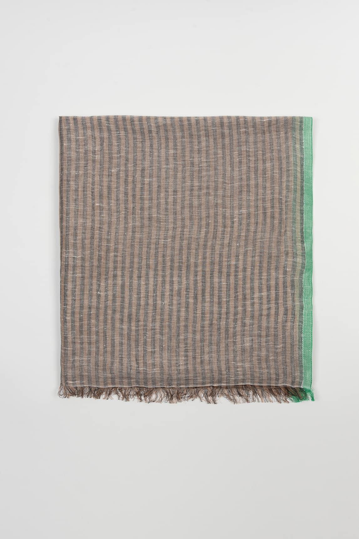 This lightweight, soft-to-the-touch scarf, made from a natural blend of 53% cotton and 47% linen, features a subtle texture and a flowing drape. It boasts a taupe striped design with mint green trim that frames the edges. Delicate fringe at the ends adds a relaxed touch. With its fresh and natural style, it's perfect for between seasons: wear it loose over your shoulders, tied around your neck, or as a light layer on breezy days. It adds a soft, luminous pop of color that elevates neutral looks and pairs especially well with whites, beiges, denim, and linen garments. We strive to display colors as accurately as possible, but they may vary slightly from reality.