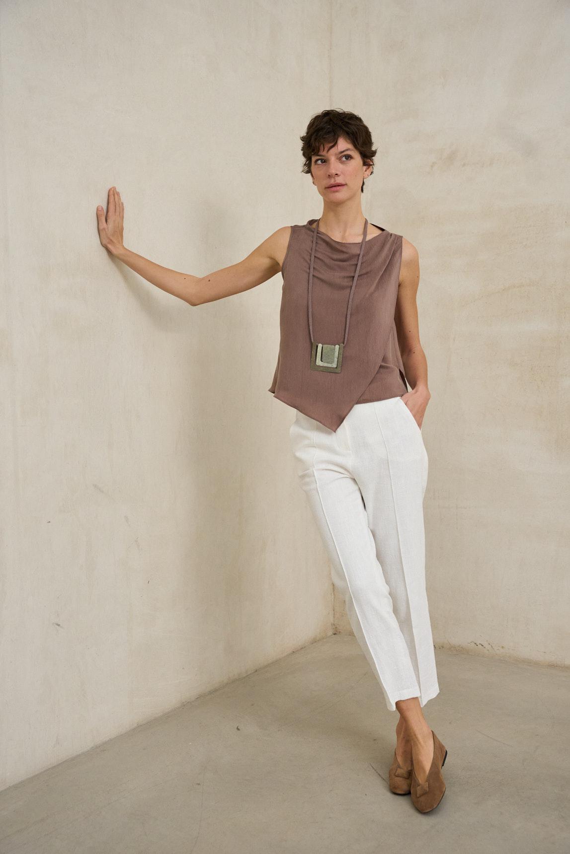 The Calina Topo soft top is a feminine and lightweight garment, designed to bring a natural and sophisticated touch to summer looks. Its fluid fabric with a delicate drape envelops the body without clinging, creating a flattering and relaxed silhouette. It features a gently draped neckline that adds movement and an elegant touch without being over the top. The sleeveless design flatters the figure and makes it an ideal choice for warm days or for layering under light jackets and blazers. The soft, warm and versatile Taupe tone combines especially well with off-whites, ecru, sand or browns, adding depth to the overall look without losing balance. We strive to display colors as accurately as possible, but they may vary slightly from reality.