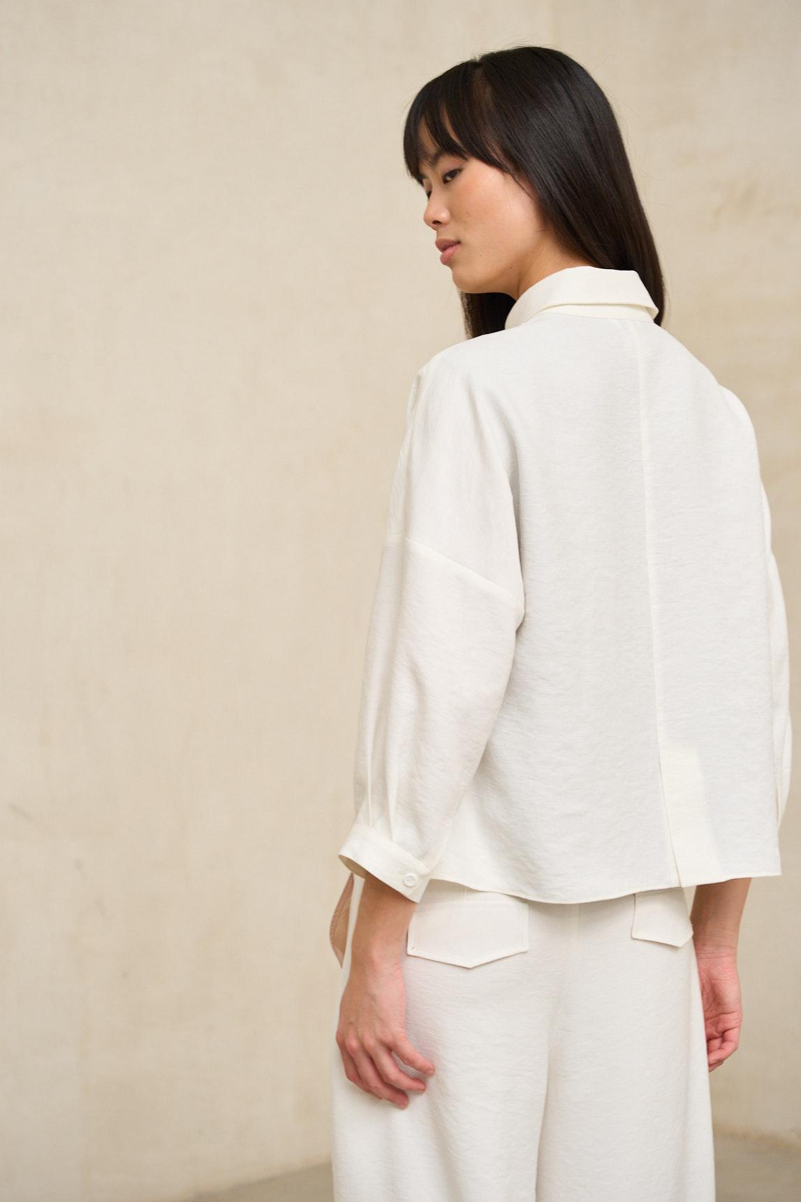 Women's shirt made from a lightweight fabric with a natural crinkle texture. It features a classic collar, a button-front closure in matching colors, and front patch pockets that add balance to the design. The long sleeves have a soft drape, and the straight hem has a fluid structure that moves with you and offers a slightly asymmetrical finish. The cut is relaxed and the silhouette straight, designed for a natural and contemporary style. Its versatile design allows it to be worn both closed and open as an overshirt, easily pairing with wide-leg trousers, denim, or simple skirts for a polished and effortless everyday look. The Lise off-white shirt exudes a sense of calm and lightness. It's a garment designed to accompany everyday life with understated elegance, ideal for relaxed urban looks or quieter moments where comfort is key without sacrificing style. Also available in taupe. We strive to display colors as accurately as possible, but they may vary slightly from reality.