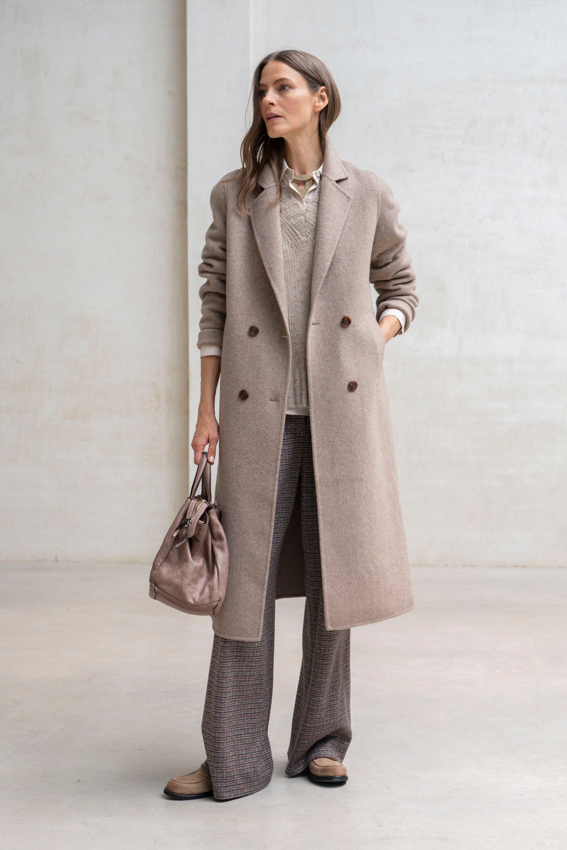 The taupe Aosta coat is the ideal choice for those seeking a balance between elegance and warmth. Its sleek design and structured cut add a sophisticated touch to any look, while its warm fabric ensures comfort on cold days. Versatile and timeless, it's perfect for pairing with dresses, trousers, or skirts all season long.