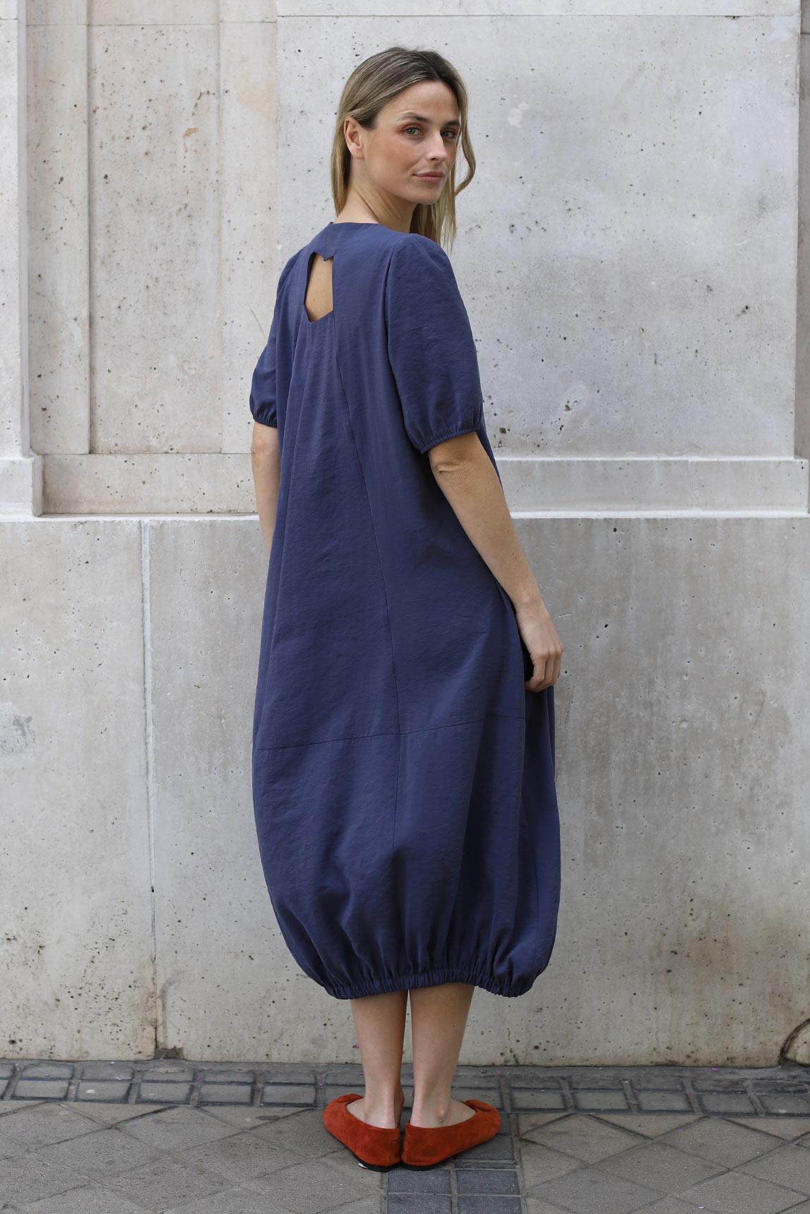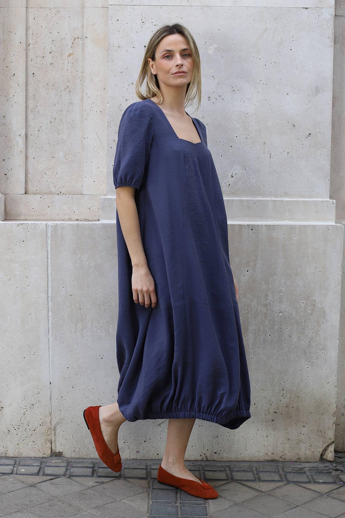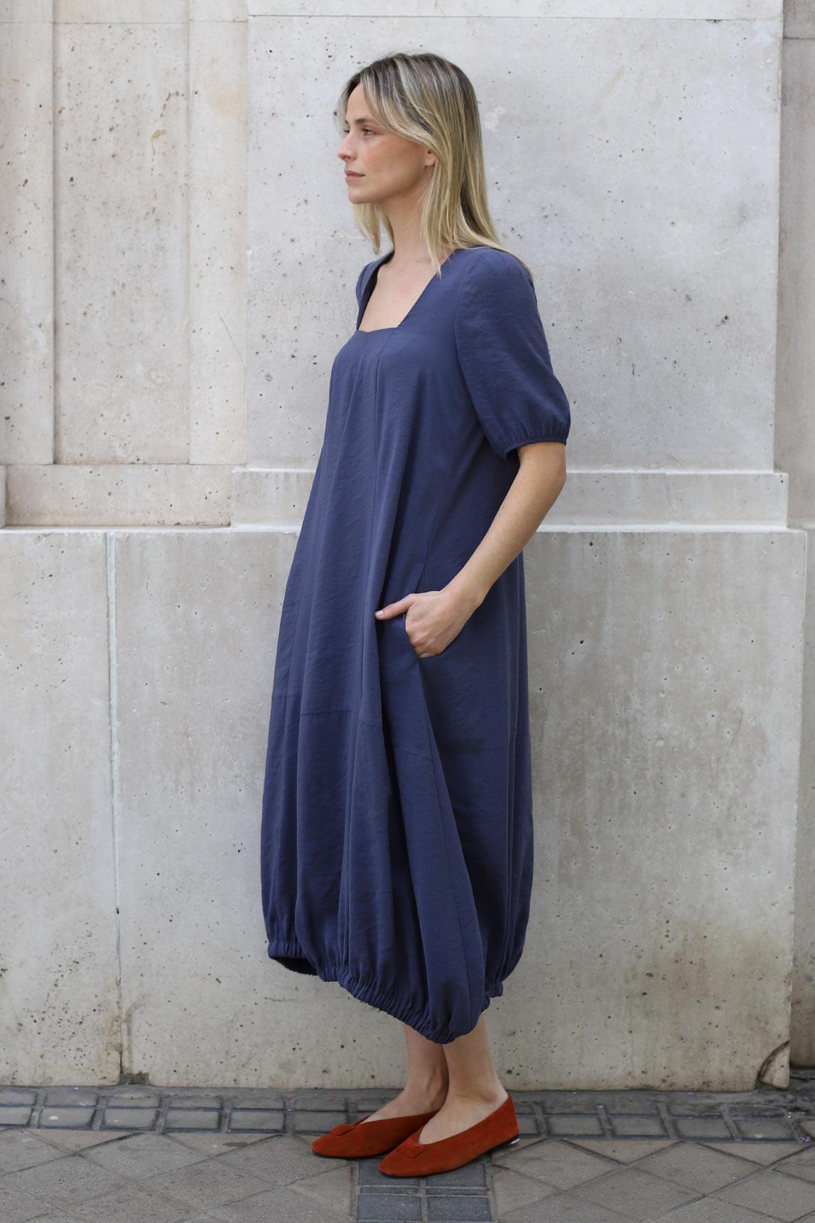 Women's dress in medium blue with a square neckline, wide short sleeves, and a softly voluminous silhouette. The design features clean lines that fall naturally from the body and gather into a balloon hem with elastic, creating a flattering, contemporary, and enveloping shape. Integrated side pockets enhance its functionality without altering the garment's clean structure, while the smooth surface provides a serene and modern look.