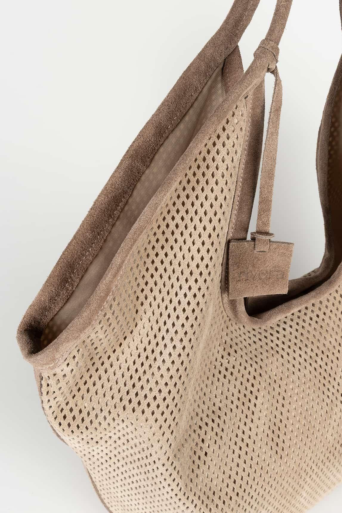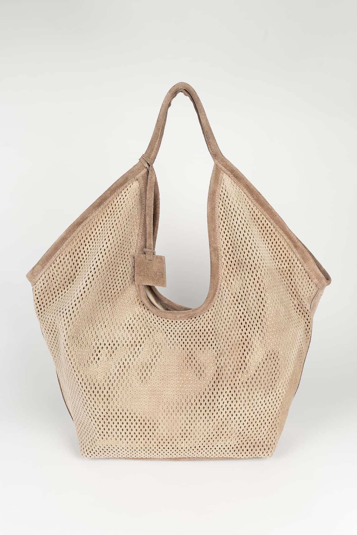 Bolso confeccionado en piel serraje perforada en tono topo claro con ribete y asas en tono topo suave, creando un contraste delicado y elegante.
