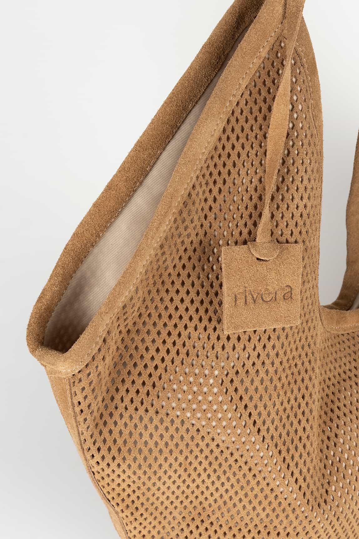 Bolso de diseño ligero y silueta amplia confeccionado en piel serraje perforada en tono camel cálido. Su acabado calado aporta frescura visual y lo convierte en una pieza ideal para primavera y verano.