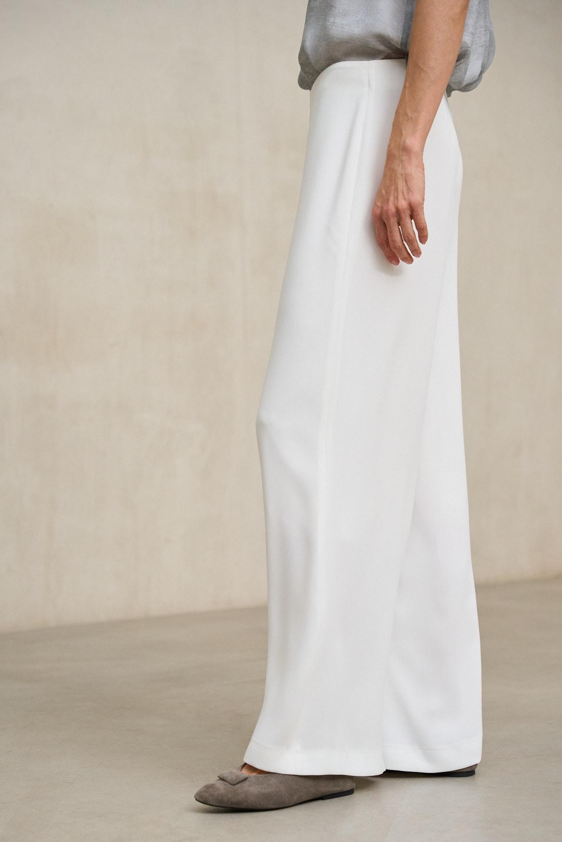 Pantalón de mujer confeccionado en tejido fluido con caída suave y estructura ligera. Presenta tiro medio y pernera ancha de líneas limpias que estilizan la silueta y aportan movimiento al conjunto. El diseño minimalista potencia su versatilidad y lo convierte en una pieza clave para looks depurados y elegantes.