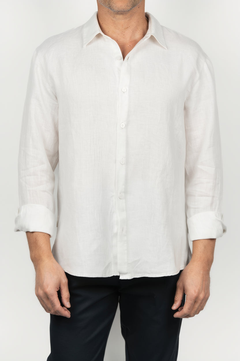 Camisa de hombre de manga larga en tono blanco, con silueta recta y diseño liso de líneas depuradas. Presenta cuello clásico, cierre frontal de botones blancos y puño abotonado, construyendo una imagen limpia, luminosa y muy fácil de llevar. La superficie ofrece una textura visual suave que añade naturalidad al conjunto sin alterar su apariencia sobria, mientras la caída se percibe ligera y ordenada.