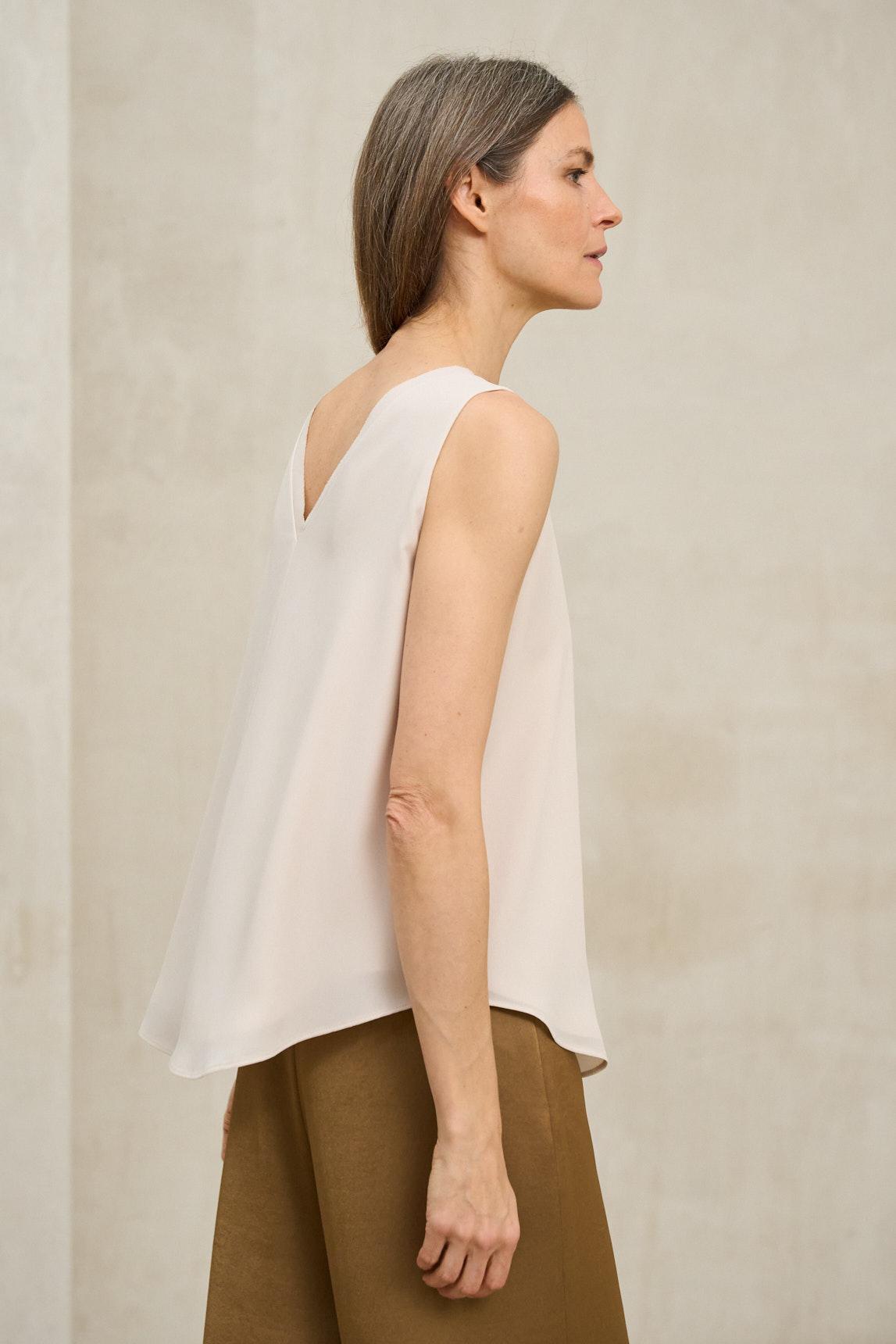 Este top sin mangas presenta una silueta fluida con escote en pico tanto en la parte delantera como en la espalda, creando una línea estilizada y ligera. El tejido muestra una caída suave y continua, con un acabado liso y delicado que aporta movimiento natural a la prenda. El bajo ligeramente redondeado suaviza la estructura y refuerza su carácter relajado, mientras que el corte amplio permite que el top se deslice con ligereza sobre el cuerpo sin ceñirse.