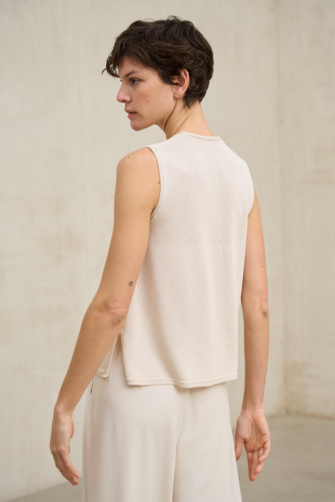 El top de punto Virel crudo es una pieza minimalista con un sutil toque romántico gracias a su escote en pico terminado con un delicado ribete de gasa. Este detalle suaviza el diseño y aporta textura ligera sin restar pureza a la prenda. Confeccionado en tejido de punto fluido y de caída suave, su corte ligeramente acampanado favorece la silueta y aporta comodidad. El tono crudo, luminoso y neutro, lo convierte en una base perfecta para estilismos monocromáticos o combinaciones con tonos tierra, azul marino o arena. Ideal como top elegante sin mangas o blusa básica refinada para primavera y verano, el top de punto Virel crudo es una prenda fácil de integrar en un armario versátil y atemporal. Nos esforzamos por mostrar los colores de la forma más fiel posible, pero pueden variar ligeramente respecto a la realidad.