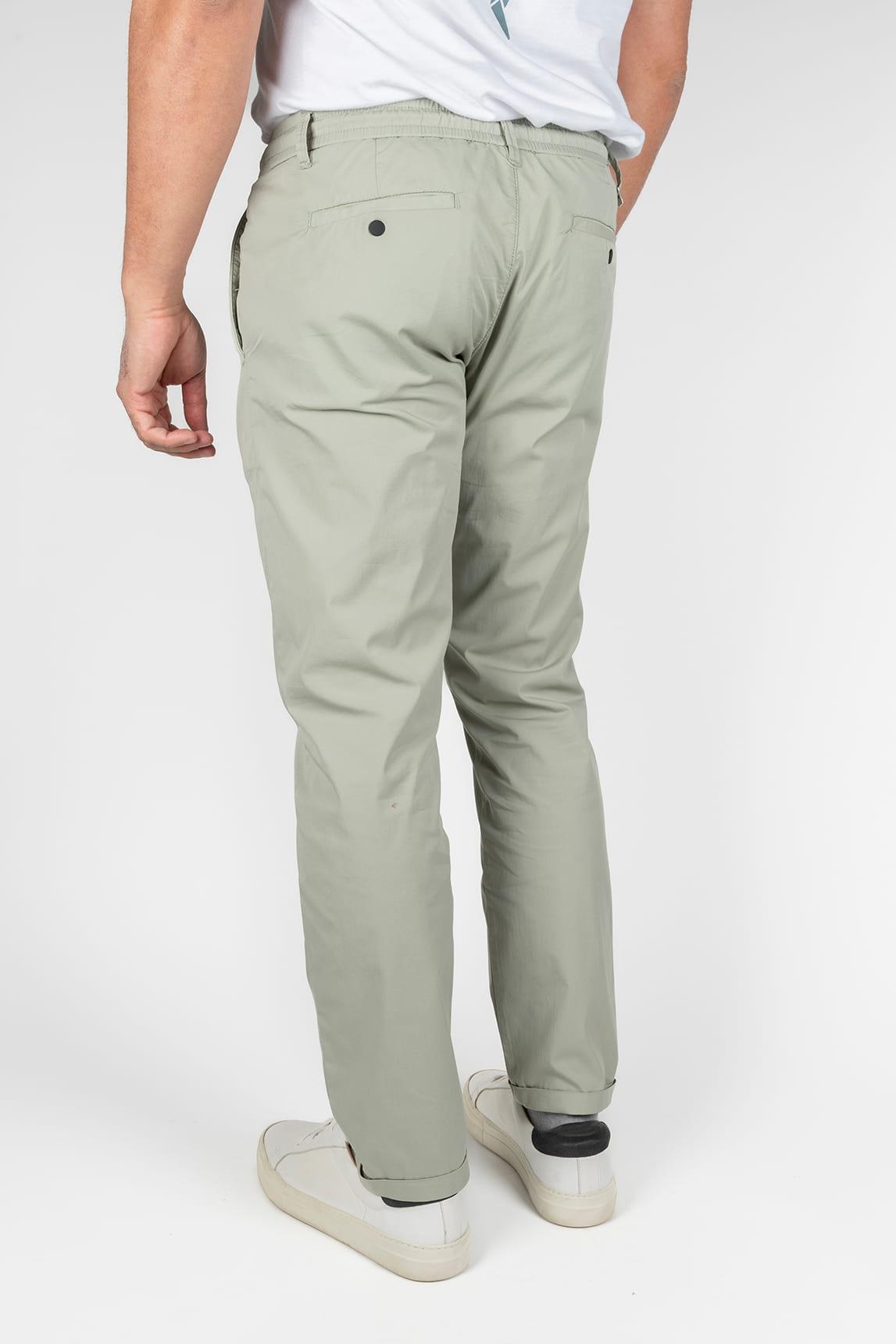 Este pantalón en tono salvia presenta una estética depurada con pernera larga y línea recta que se adapta con naturalidad al movimiento. La cintura elástica con cordón ajustable se integra de forma visible, aportando un matiz funcional que refuerza su carácter relajado. El diseño se completa con bolsillos laterales y un frontal limpio que mantiene una imagen ordenada, mientras el tejido de apariencia lisa y ligera estructura ofrece una caída equilibrada y continua.