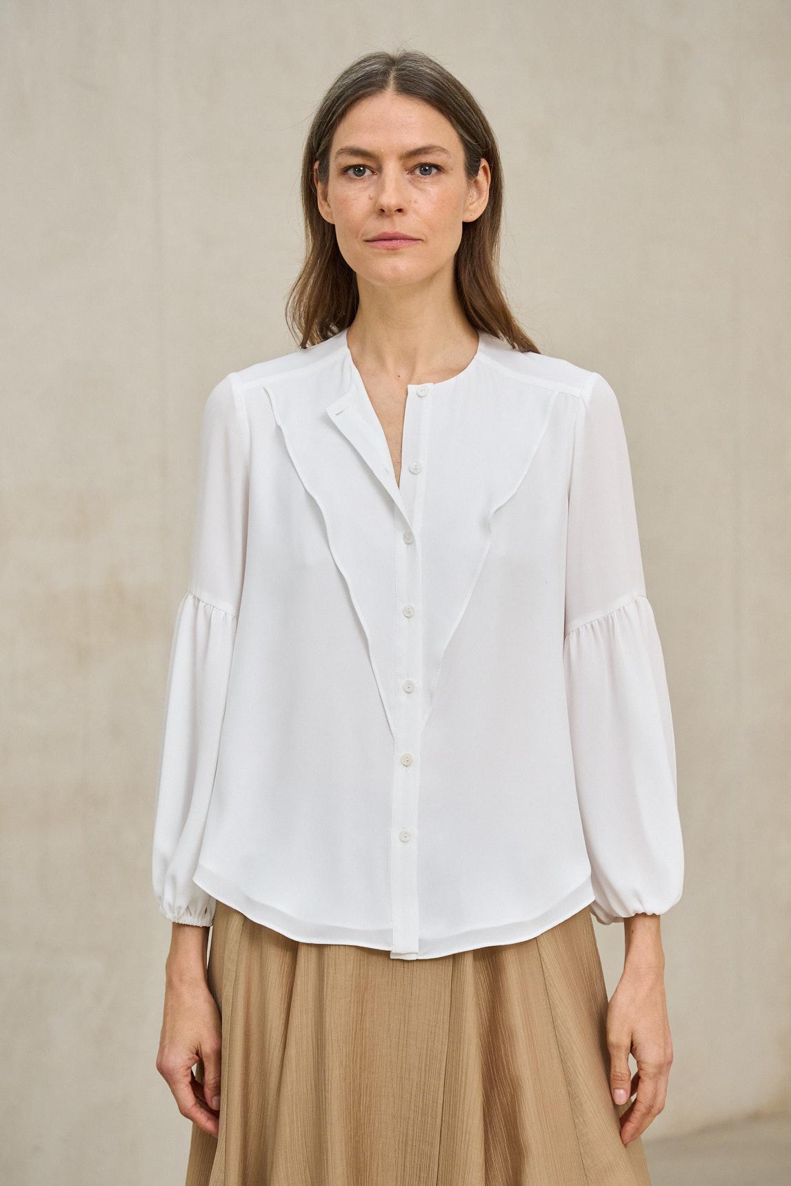 La Blusa Liora blanco es una prenda ligera y fluida diseñada para aportar suavidad y elegancia natural al look. Confeccionada en tejido vaporoso de caída delicada, presenta escote en pico y manga larga amplia con acabado elástico en el puño, que genera un efecto ligeramente ablusado. Su silueta relajada y el movimiento del tejido aportan feminidad sin exceso, convirtiéndola en una blusa versátil tanto para estilismos formales como para combinaciones más casuales.
