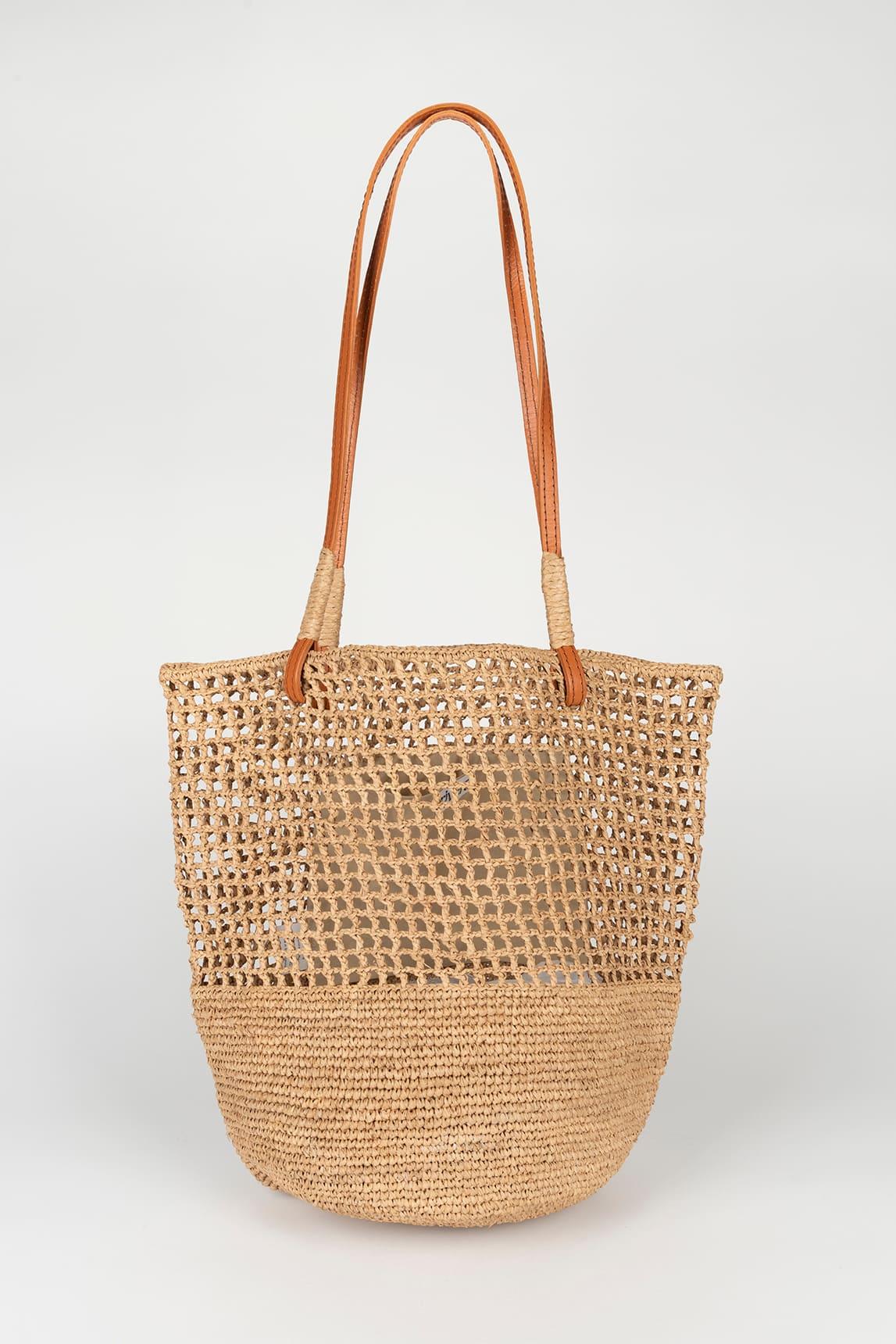 Bolso de mujer confeccionado en rafia natural con silueta amplia y base redondeada. El diseño combina un cuerpo superior de estructura calada tipo rejilla con una parte inferior más compacta de trenzado cerrado, creando un contraste de texturas que aporta ligereza visual y un acabado artesanal muy marcado. Incorpora asas largas en tono cuero que permiten llevarlo cómodamente al hombro, añadiendo un matiz cálido y natural al conjunto.