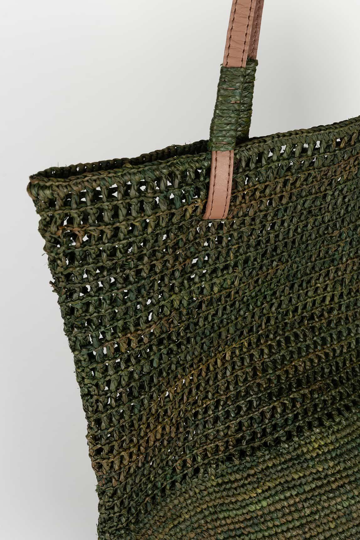El bolso Tervan rafia verde oliva es una pieza de inspiración natural que combina artesanía textil y estructura amplia en un diseño ligero y funcional. Su cuerpo trenzado en fibra presenta un juego de entramado abierto en la parte superior y tejido más compacto en la base, creando contraste visual y mayor resistencia en la zona inferior.