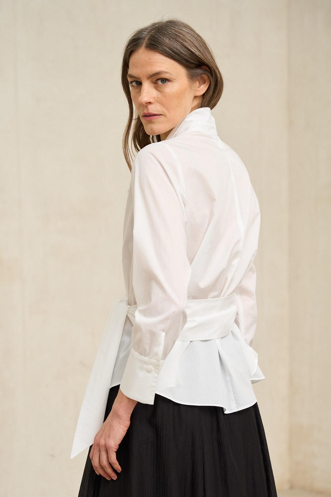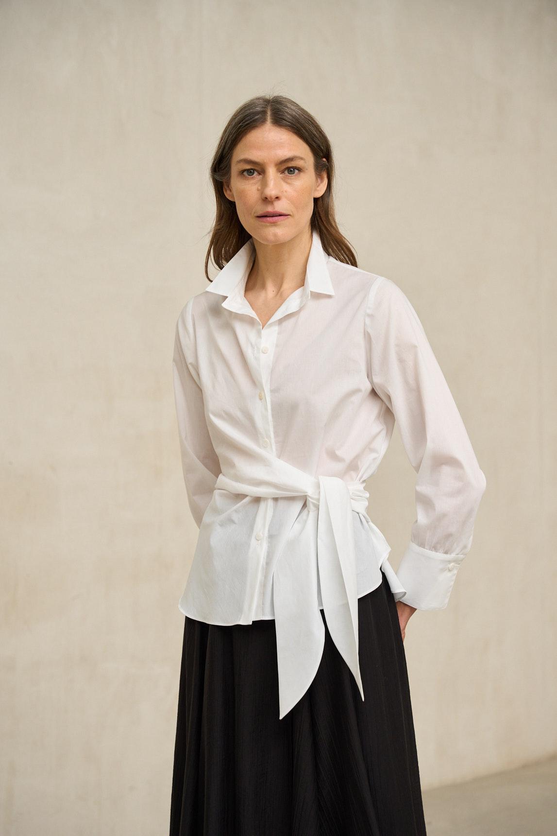 La Camisa Vaelia blanco roto destaca por su diseño cruzado con lazada lateral que aporta movimiento y un aire contemporáneo a la silueta clásica. Confeccionada en tejido ligero y de caída suave, presenta cuello camisero y manga larga con puño, equilibrando estructura y fluidez. El cruce frontal estiliza visualmente el torso y permite ajustar ligeramente la prenda mediante la lazada, creando una silueta femenina sin resultar ceñida. Su bajo ligeramente asimétrico aporta dinamismo y facilita llevarla tanto con pantalones rectos como con siluetas más amplias. El tono blanco roto suma luminosidad sin la frialdad del blanco óptico, integrándose con naturalidad en estilismos neutros junto a negro, camel, arena o gris claro. Es una pieza versátil que funciona tanto en contextos más formales como en looks urbanos refinados. Una camisa diferente y elegante que eleva cualquier conjunto sin perder sobriedad. Nos esforzamos por mostrar los colores de la forma más fiel posible, pero pueden variar ligeramente respecto a la realidad.