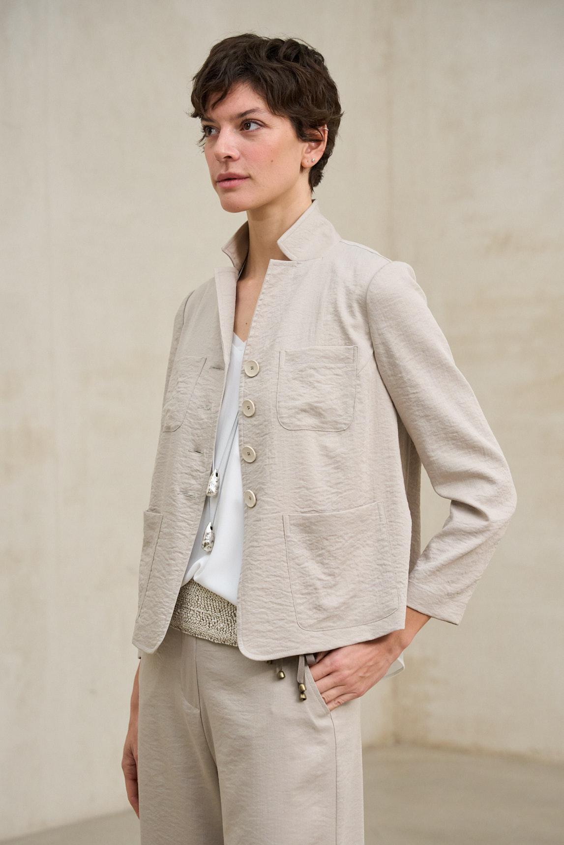 Chaqueta de mujer confeccionada en tejido con textura arrugada de aspecto natural. Presenta cuello solapa, cierre frontal con botones al tono y dos bolsillos de plastrón amplios que aportan funcionalidad al diseño. Manga larga y bajo ligeramente recto, con una estructura suave que combina confort y ligereza. La Chaqueta Alva hueso destaca por su estética contemporánea y relajada. Puede llevarse como prenda principal o como sobrecamisa ligera, ideal para looks de primavera combinada con pantalones de lino, faldas o denim. Su color arena refuerza su versatilidad y la convierte en una pieza esencial para un armario neutro y elegante. Nos esforzamos por mostrar los colores de la forma más fiel posible, pero pueden variar ligeramente respecto a la realidad.