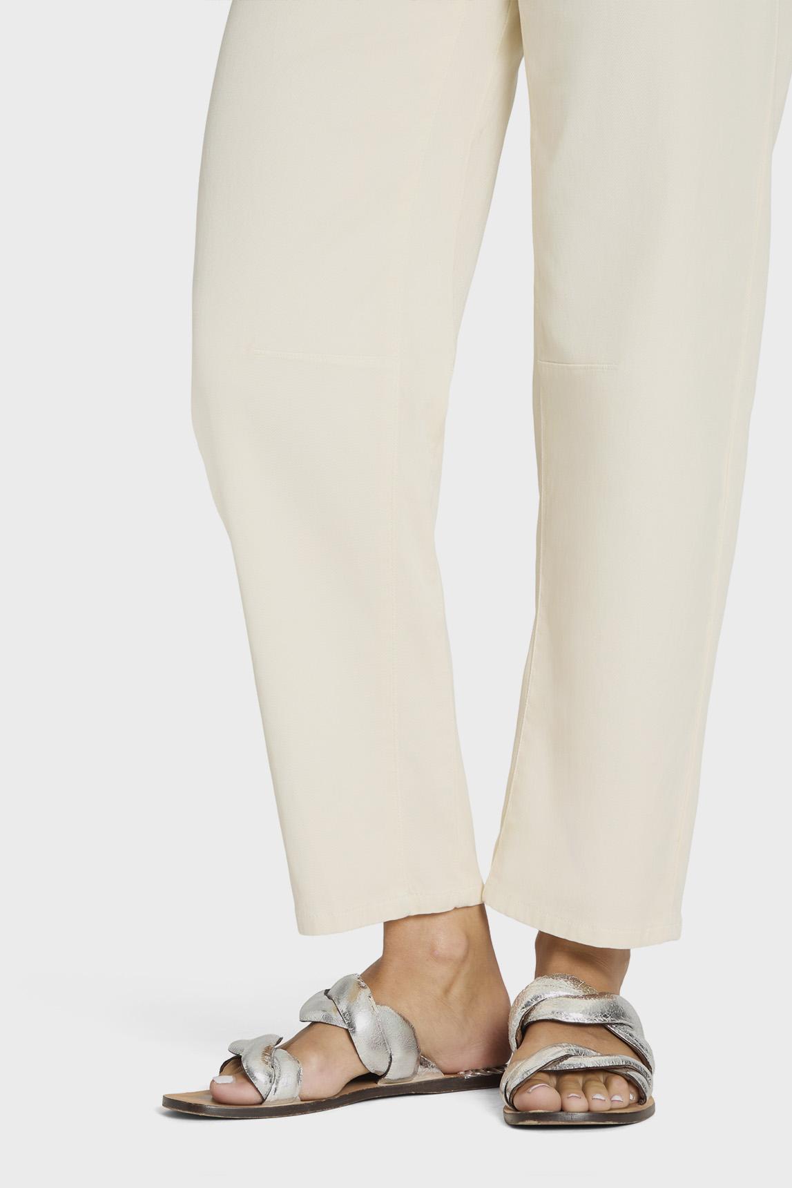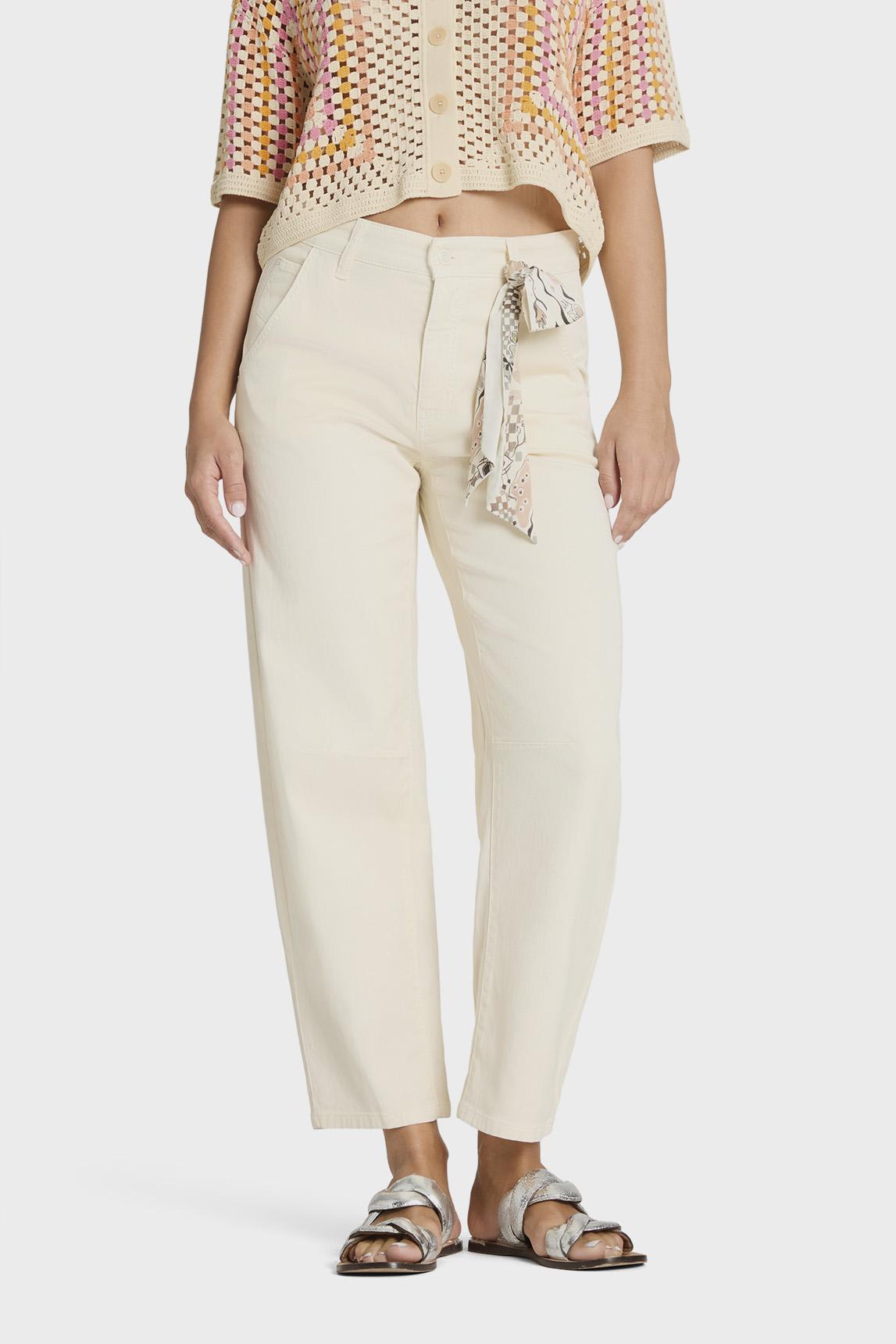 El pantalón Cambio O-Shape Cropped Orelie presenta la moderna silueta O-Shape, caracterizada por su volumen suave y redondeado que acompaña la figura con naturalidad. La pernera ligeramente estrechada y su largo cropped crean una línea equilibrada y contemporánea que aporta ligereza visual y un ajuste cómodo. Confeccionado en sarga suave PPT con mezcla de Tencel y algodón, el tejido ofrece una caída fluida, tacto suave y gran comodidad durante todo el día. El tono blanco roto aporta luminosidad y elegancia natural, convirtiéndolo en una base versátil para estilismos de primavera y verano. Largo: 28" (aprox. 71 cm de entrepierna) El diseño se completa con un pañuelo anudado con exclusivo estampado CAMBIO, que añade un detalle distintivo y sofisticado a la prenda. Un pantalón actual que combina funcionalidad, comodidad y estilo con un aire relajado y refinado.