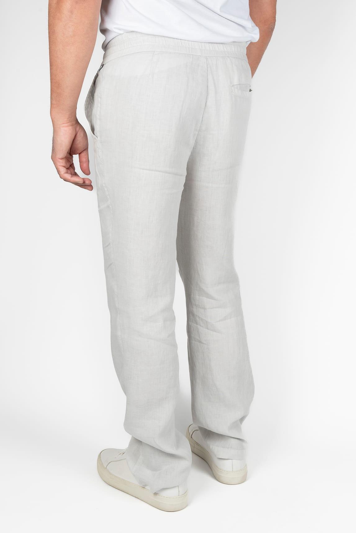 Este pantalón en tono blanco presenta una silueta relajada con pernera larga y una caída fluida que aporta ligereza al conjunto. La cintura elástica con cordón ajustable se integra como un detalle visible que refuerza su carácter práctico, mientras los bolsillos laterales y el frente limpio mantienen una estética equilibrada. El tejido de apariencia ligera y textura suavemente natural sugiere frescura, con un acabado uniforme que potencia su estilo depurado.