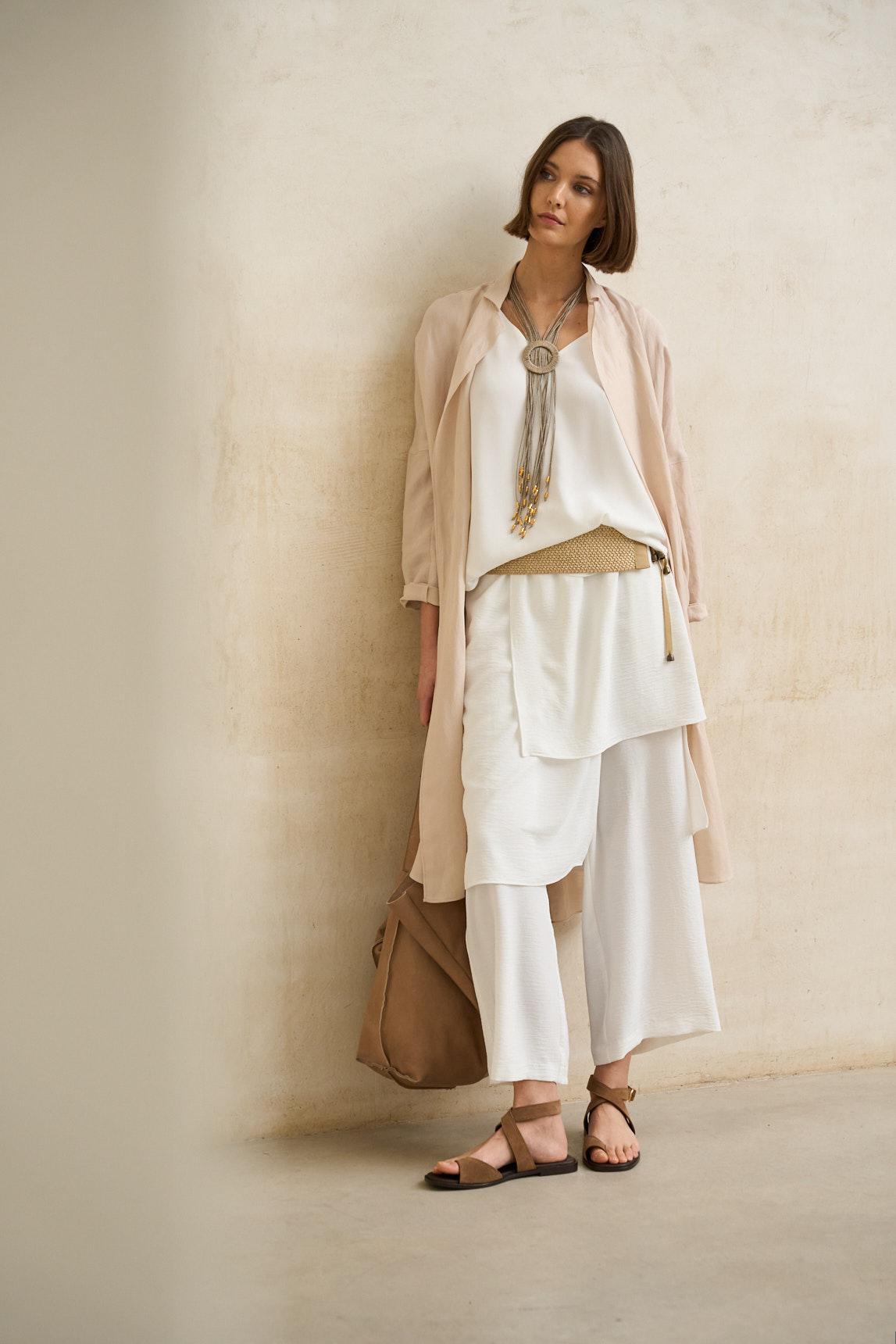 Con cintura elástica fruncida y cordón ajustable, este pantalón efecto falda se presenta en un blanco roto luminoso que realza su textura sutilmente arrugada. El diseño envolvente del delantero crea un cruce limpio con una abertura central discreta, y el bajo cae con una ligera asimetría que aporta movimiento sin perder sencillez. La silueta se ve fluida y cómoda, con un largo midi pensado para acompañar el paso. Su estética minimalista encaja con múltiples estilos: llévala con un top ceñido para equilibrar el volumen, con camisa ligera para un look más pulido o con una camiseta básica para un aire casual. Con sandalias planas se siente fresca y de día; con mules o cuñas gana presencia para una tarde o una cena. Disponible también en beige arena. Es una prenda que ilumina el conjunto sin esfuerzo y se adapta a planes largos: cómoda en la cintura, favorecedora por el cruce frontal y perfecta para crear looks serenos que se ven cuidados desde el primer momento. Nos esforzamos por mostrar los colores de la forma más fiel posible, pero pueden variar ligeramente respecto a la realidad.