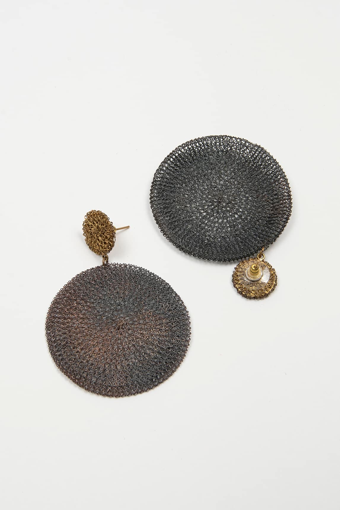 - Pendientes circulares elaborados en malla metálica con efecto bronce envejecido.