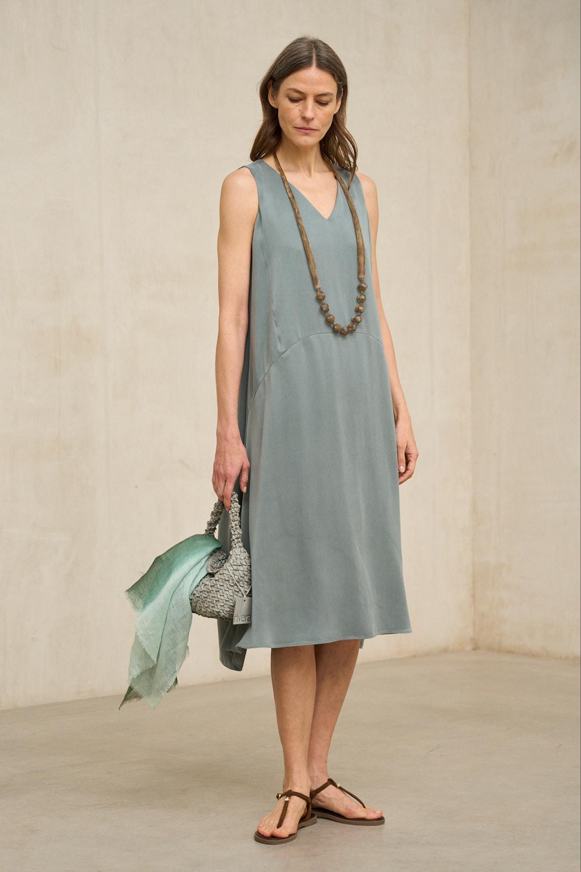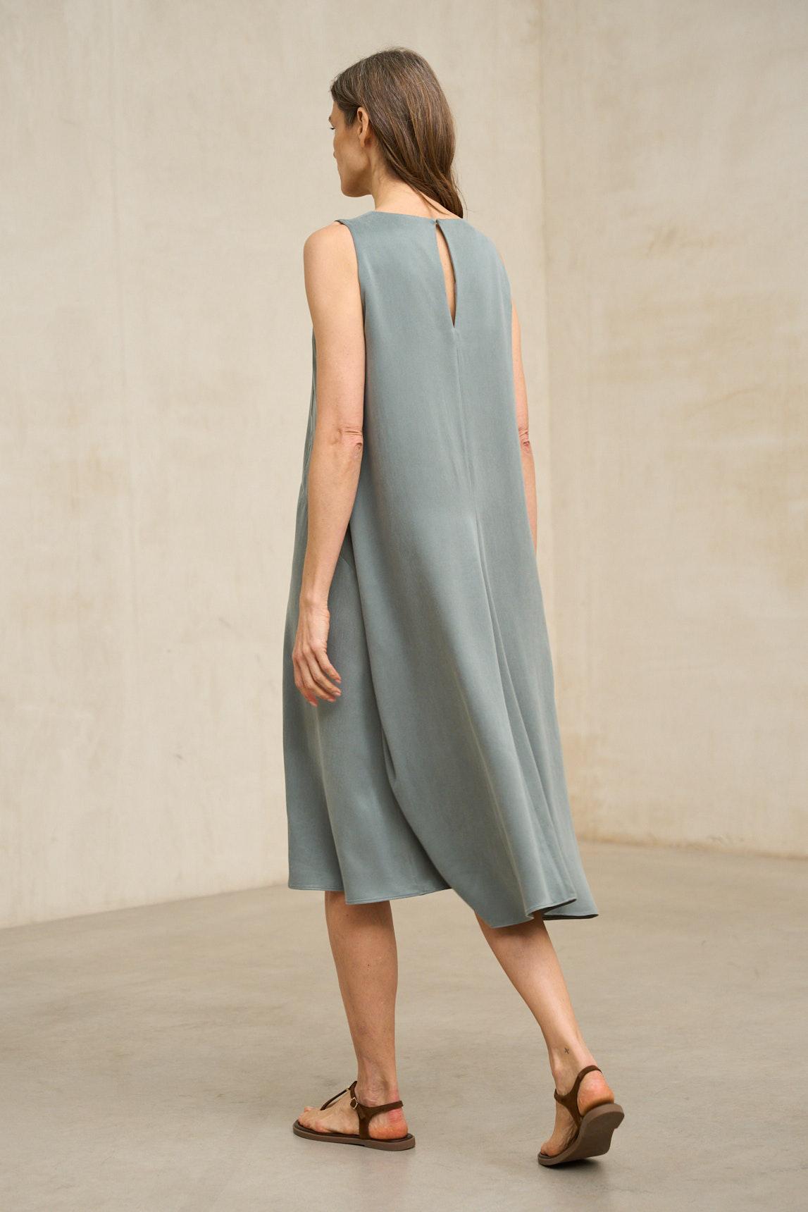 El vestido Naïra verde salvia mantiene la silueta fluida y el diseño minimalista que definen el modelo. Con escote en pico y corte sin mangas, presenta una estructura amplia que cae con naturalidad, creando movimiento y ligereza al caminar. Su patrón relajado se despega suavemente del cuerpo, aportando comodidad y un efecto estilizado sin ceñir. El largo midi y la caída suave del tejido refuerzan su carácter versátil y contemporáneo, ideal para el día a día o para estilismos más cuidados con accesorios protagonistas. El tono verde salvia aporta frescura y serenidad al diseño, convirtiéndolo en una alternativa luminosa al negro. Combina fácilmente con tonos neutros, cuero natural o complementos en rafia para un look equilibrado y sofisticado. Una pieza cómoda, atemporal y fácil de llevar, pensada para construir estilismos ligeros con personalidad. Nos esforzamos por mostrar los colores de la forma más fiel posible, pero pueden variar ligeramente respecto a la realidad.