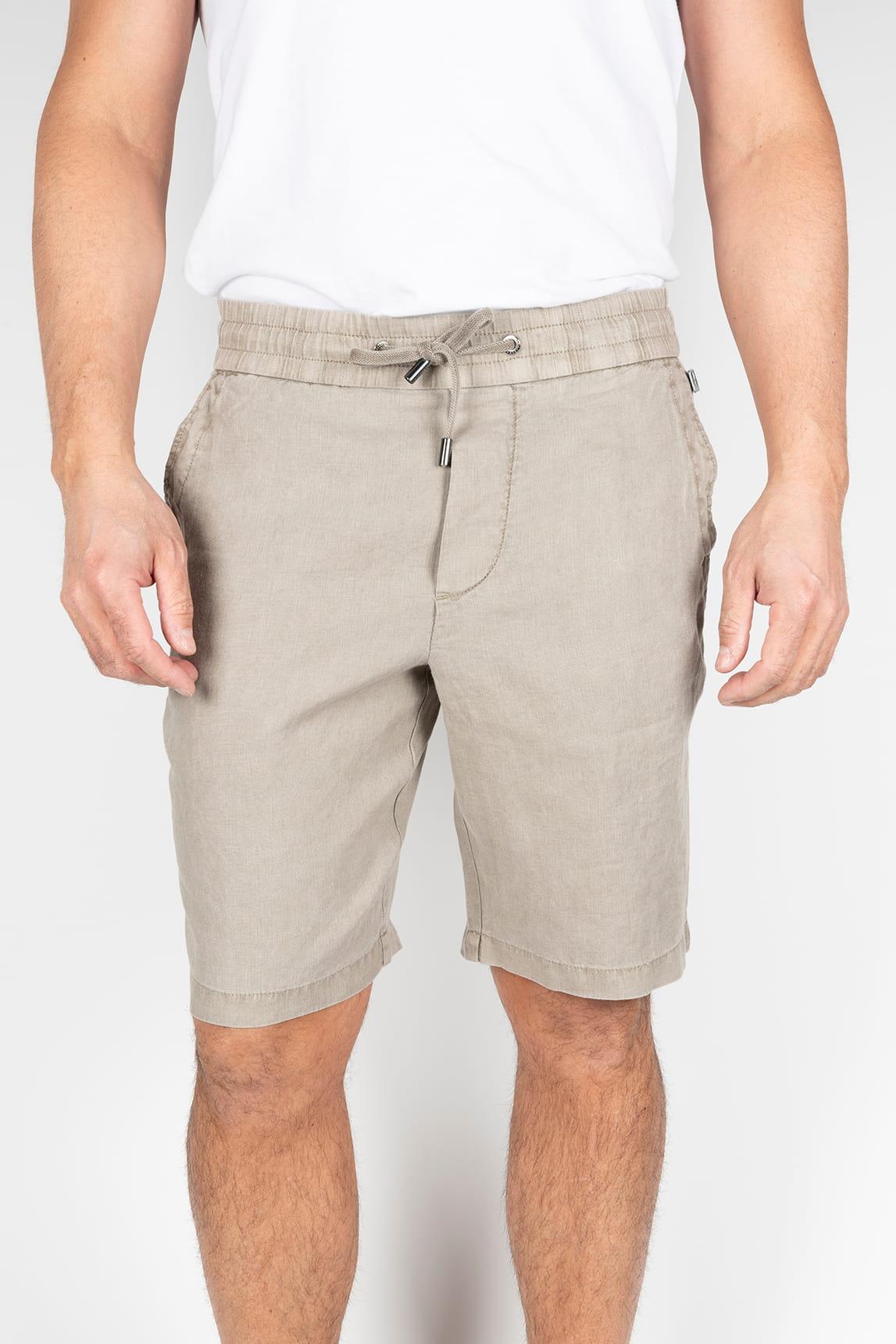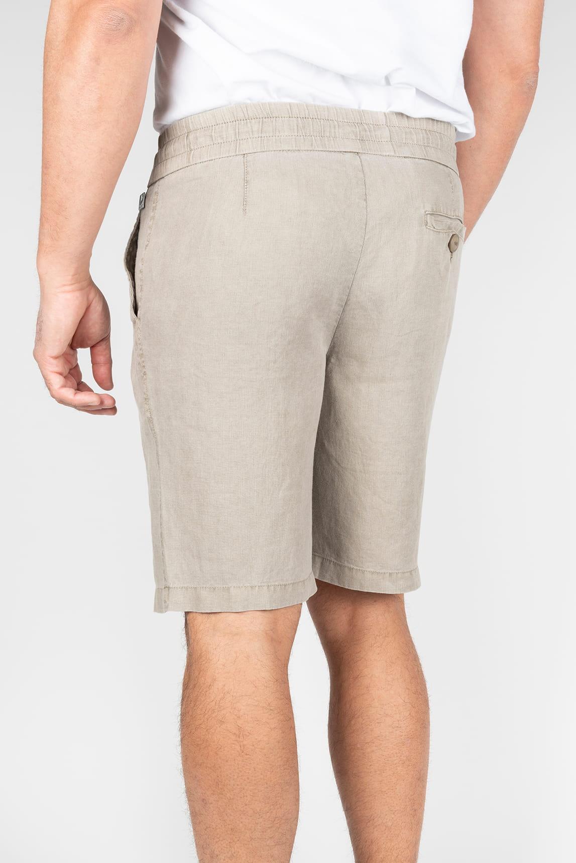 Esta bermuda en tono hueso presenta una estética limpia y luminosa, con largo por encima de la rodilla y una silueta recta que aporta equilibrio y comodidad. La cintura elástica con cordón ajustable se muestra de forma visible, reforzando su carácter funcional, mientras los bolsillos laterales y el frente depurado mantienen una imagen ordenada. El tejido de apariencia ligera y textura suavemente natural sugiere frescura, con una caída fluida que acompaña el movimiento con naturalidad.