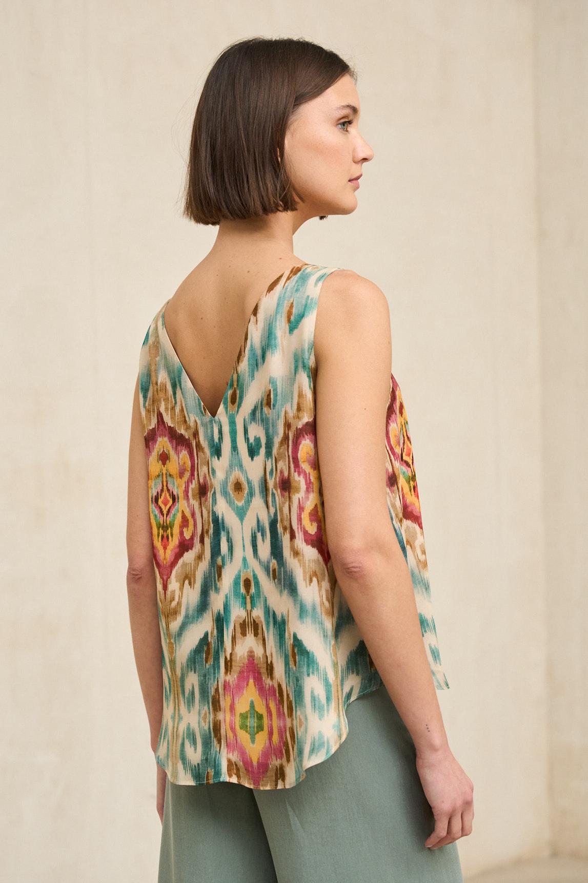 The Zafira Printed Blouse is a lightweight and vibrant piece that combines a flowing design with a handcrafted geometric pattern in olive green, coral, ecru, and warm tones. Its color scheme adds dynamism without losing balance, making it a garment with character that's also easy to incorporate into any wardrobe. It features a gently rounded V-neck and a sleeveless design, with a straight, naturally draped silhouette that flatters without being restrictive. The lightweight fabric enhances its movement and breathability, making it ideal for spring and summer. It can be combined with neutral trousers in ecru, beige or green for a more refined look, or coordinated with plain garments in one of the tones of the print to reinforce the visual coherence of the outfit. A feminine and versatile blouse that brings color, texture and personality with a natural and contemporary approach. We strive to display colors as accurately as possible, but they may vary slightly from reality.
