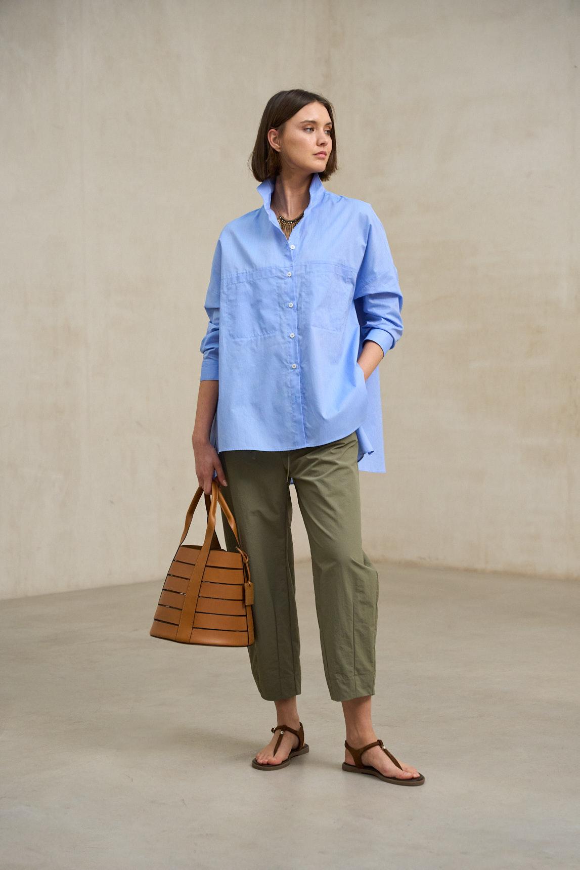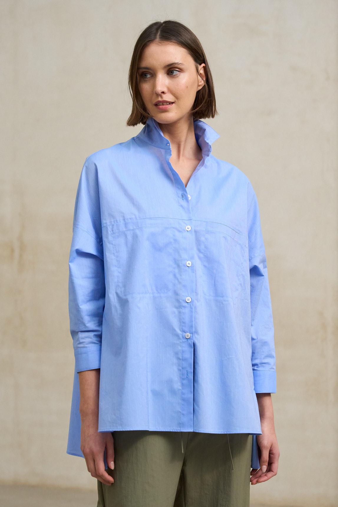 The medium blue Seraya Shirt is a garment with clean lines and a relaxed silhouette that combines freshness and light structure. Made from soft fabric with a natural drape, it features a classic shirt collar, front button closure, and long sleeves with a simple cuff.