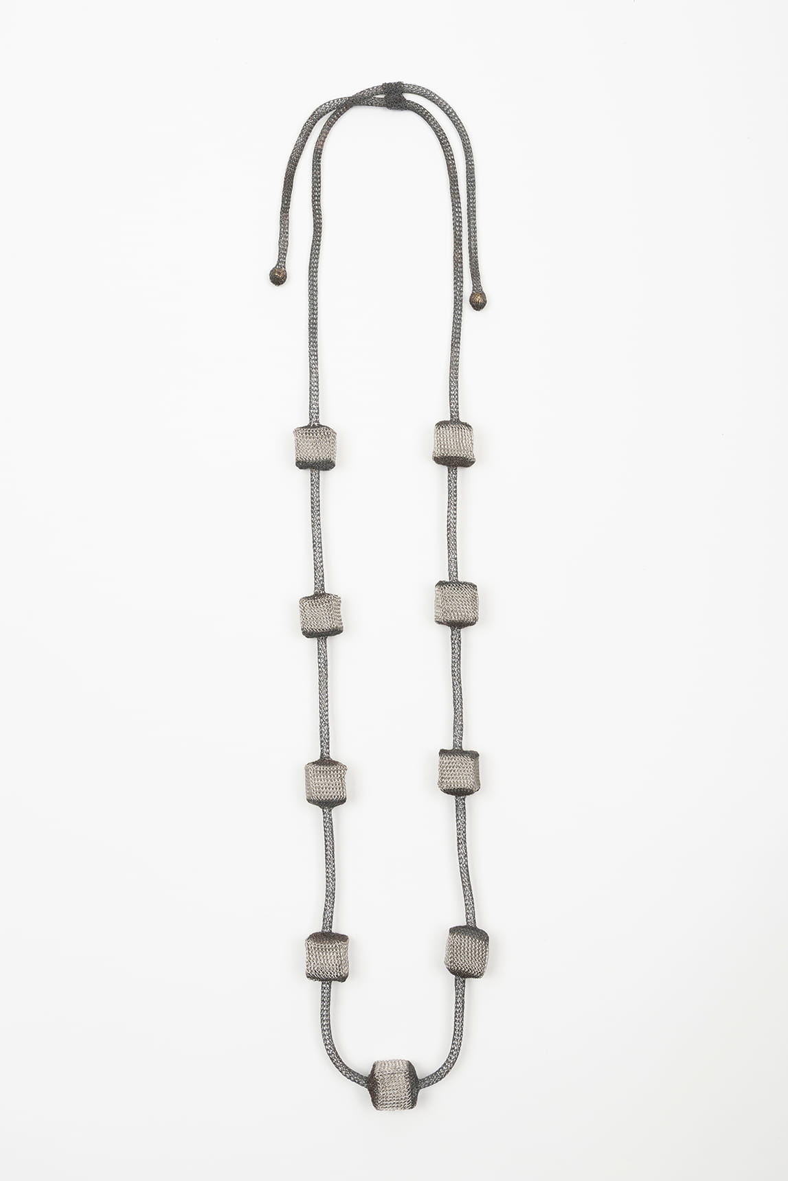 - Collar largo elaborado íntegramente en malla metálica plateada.